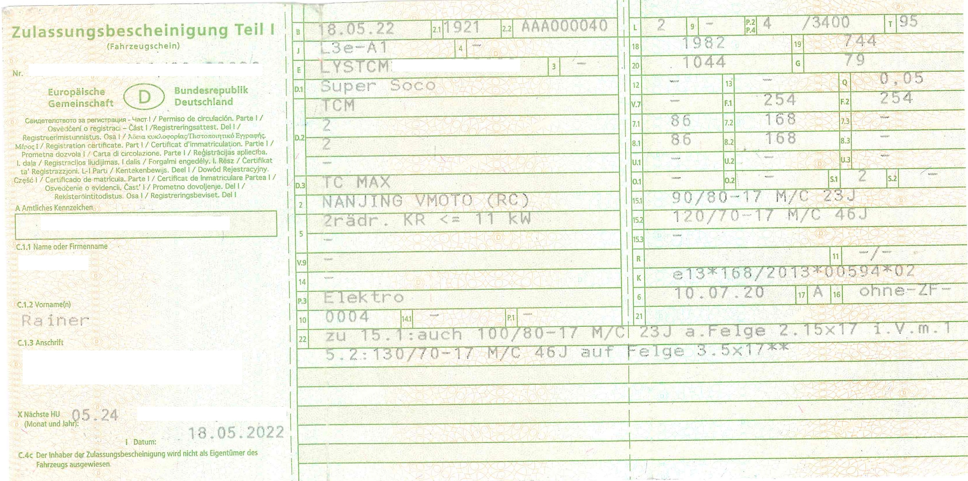 Im Dezember bin ich schon mal mit der TCmax bei der Dekra vorgefahren. Der Freiraum zwischen Reifen und Schutzblech bzw. Gabel wurde als OK befunden. Nur ist der neue hintere Reifen 2,9% größer als der originale, so dass eine Probefahrt verlangt wurde mit GPS-Geschwindigkeitsmessung. Die TCmax könnte ja jetzt vom Fahrer unbemerkt auf über 95km/h kommen. Meine Aussage, dass vorher die Tachovoreilung 7km/h war und die 95km/h in ebenen Gelände und bei Windstille mit der Motorleistung eh nicht zu machen sind, hat nix gebracht. Leider war es zu kalt zum Motorradfahren :lol:, so das erst mal keine Reifenfreigabe erteilt werden konnte.