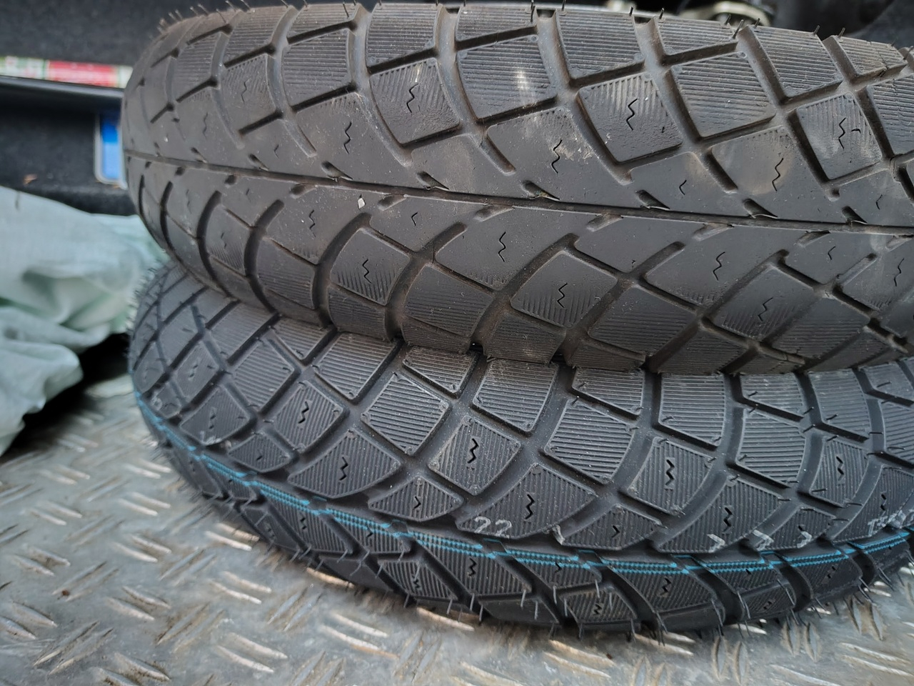 Nachdem ich die ersten beiden Winter mit den Kenda K701 gefahren bin (der vordere hatte einen Sägezahn ausgebildet und der hintere war runter), hatte ich vor zwei Jahren auf Heidenau K66 M+S Silica gewechselt. Nun, nach zwei Wintern, ist der hintere Reifen von rund 9mm auf 2,5mm runter gefahren. Die Verschleißanzeiger sind gut frei gefahren. Die gesetzliche Mindestprofiltiefe für unsere 125er ist zwar nur ein mm, aber ich hab mich durchgerungen, einen neuen Schlappen zu kaufen - einmal bei Glätte auf die Fresse gelegt ist normalerweise teurer. Ich denke, der Reifen hatte rund 15tkm runter.