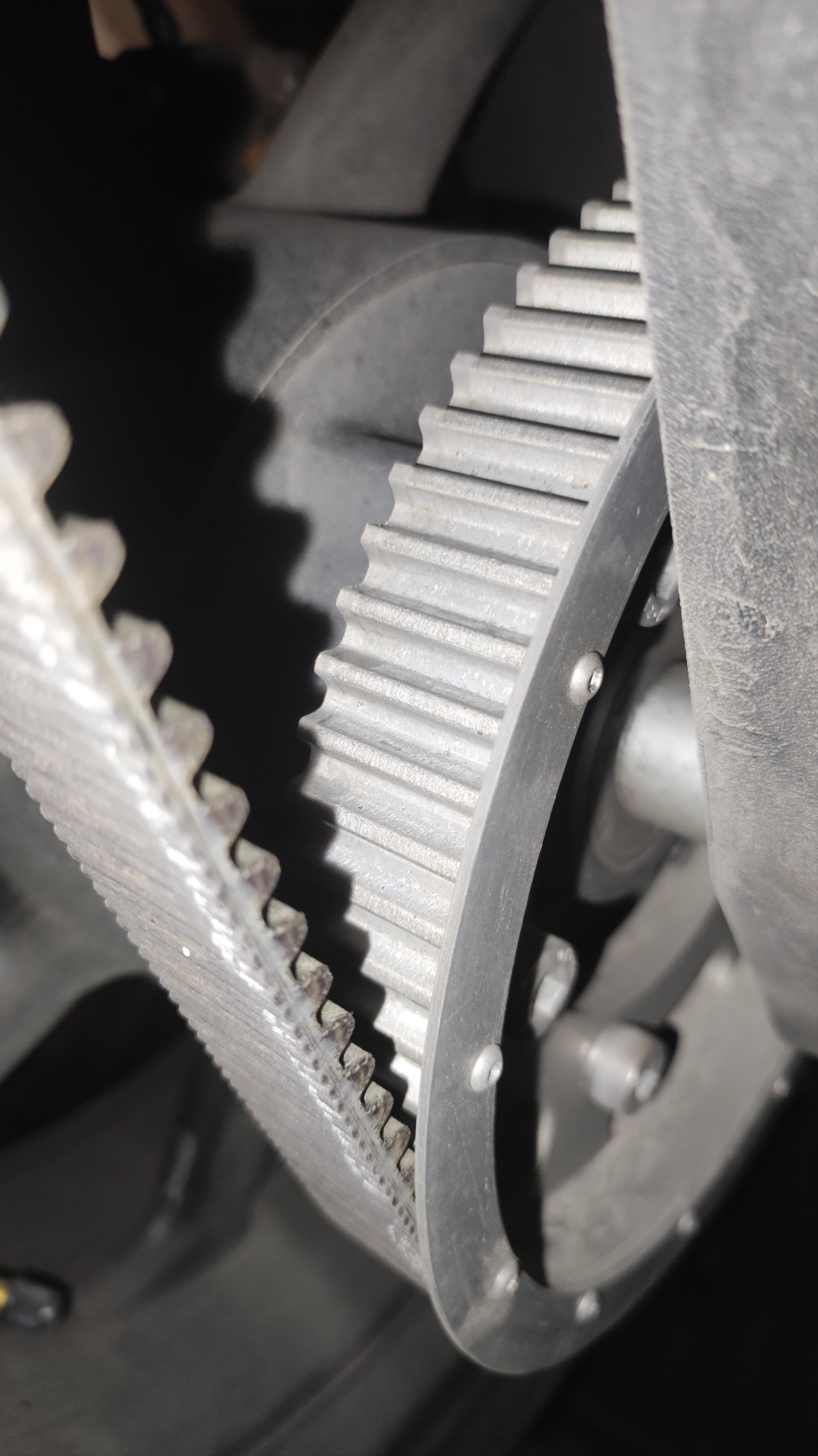 Ja, hinten läuft der Zahnriemen mit Abstand zur Deckscheibe, das sieht man am dunklen Rand, auch auf den Zähnen.