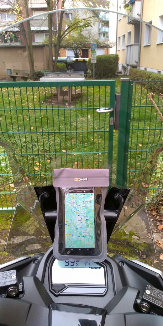 Habe heute einen Teil eines Besenstiels geopfert, um eine Handyhalterung zwischen den Metallstreben der hohen Scheibe anzubringen. Die Smartphonetasche wird noch ersetzt werden, durch eine mit mehr Features. Wichtig für mich vor allen Dingen zusätzlicher Staurum und kleineres Aussenmaß. Nennt sich: "crivit Fahrrad-Smartphonetasche, mit Fenster zur Bedienung"
