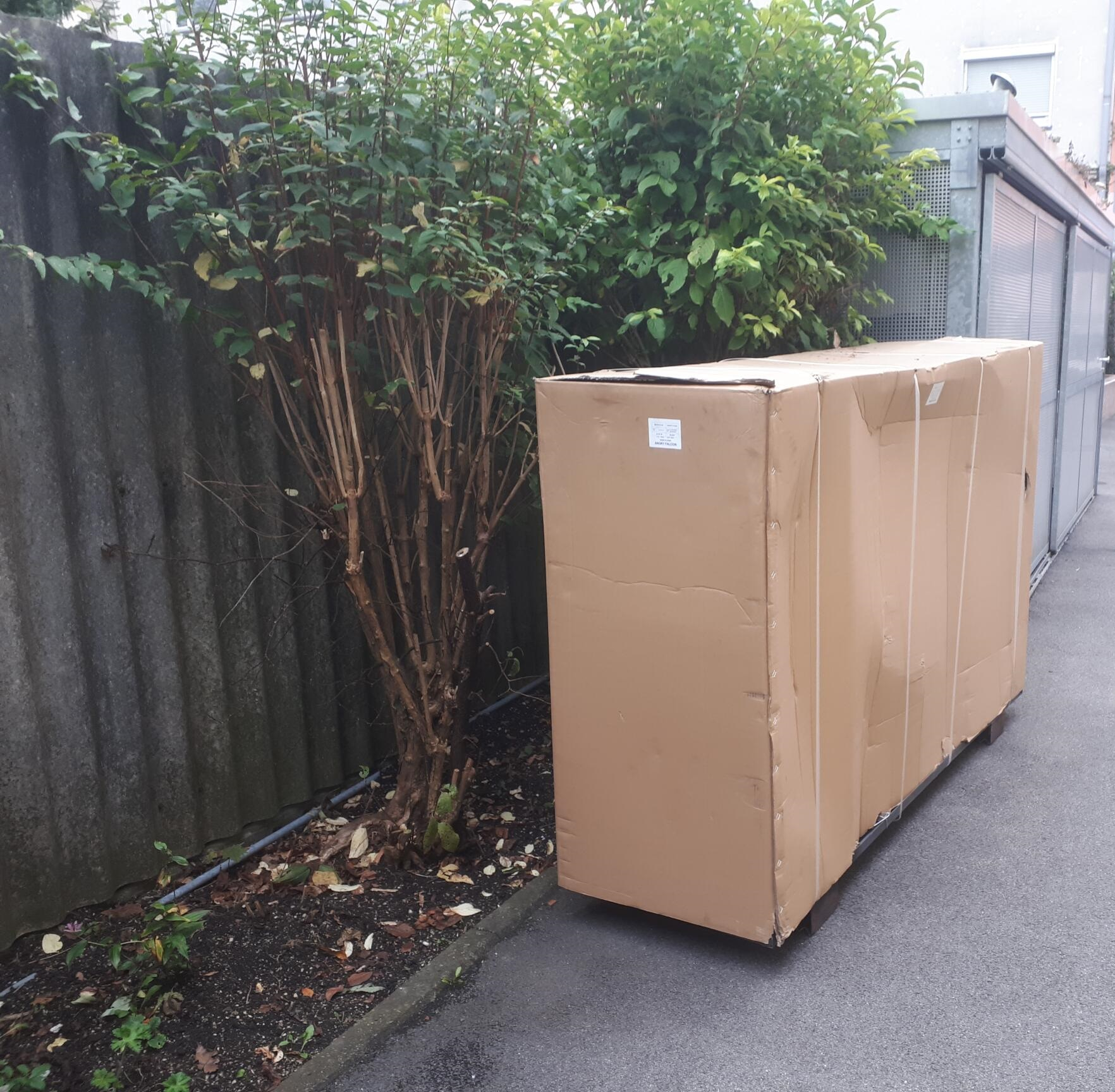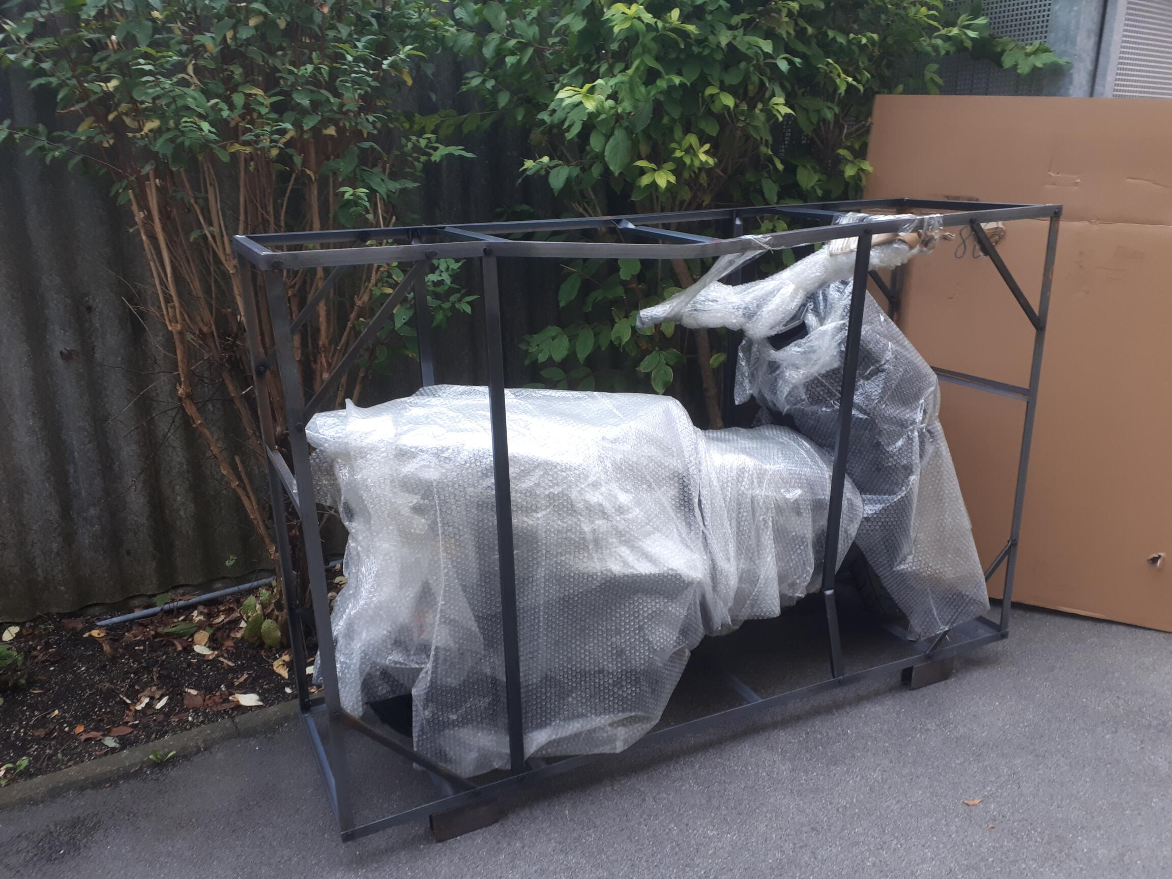 Geliefert Wurde der Angry Falcon im großen Karton. Auf der Palette passt er längs auf den Handhubwagen, daher war auch die schmale Einfahrt zwischen Pfosten hindurch kein Problem.