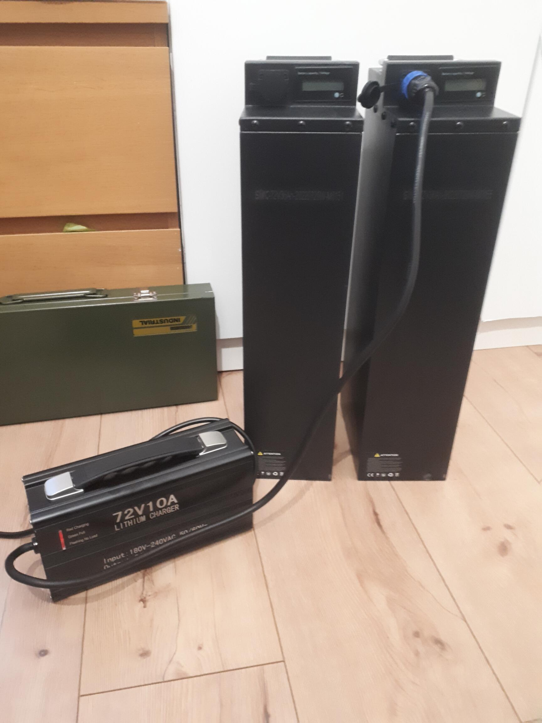 Ausgepackt, Akkus entnommen und ab zum Laden. Gut tragbar, man merkt die 15kg nicht, vor allem wenn man je einen Akku in der Hand hat.