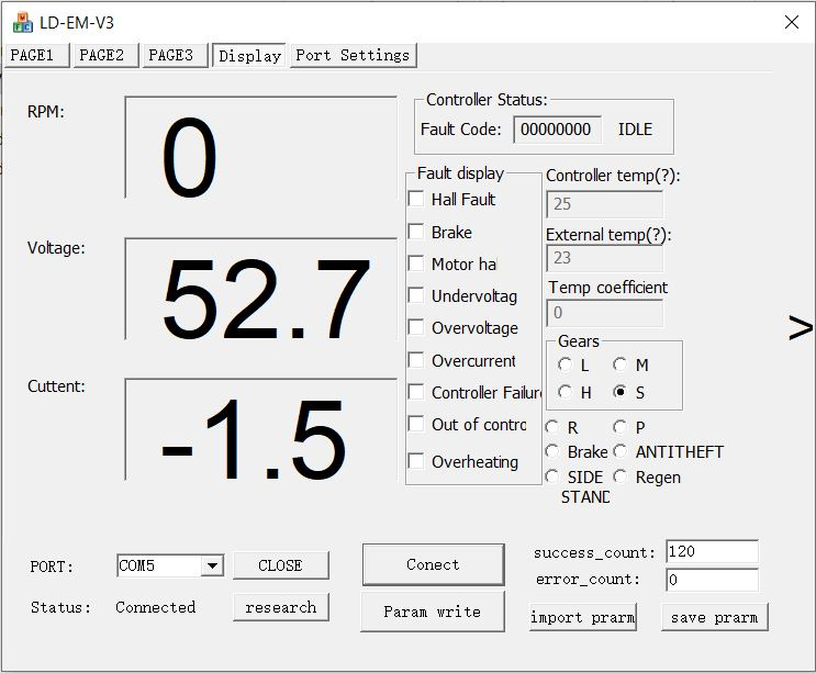 Die Software verbindet sich mit dem Scooter, wenn die MCU eingeschaltet ist, und wenn Sie Messwerte auf der Statusseite für RPM, Strom und Regeneration wünschen, sollte sie im mittleren Ständer in Betrieb sein.