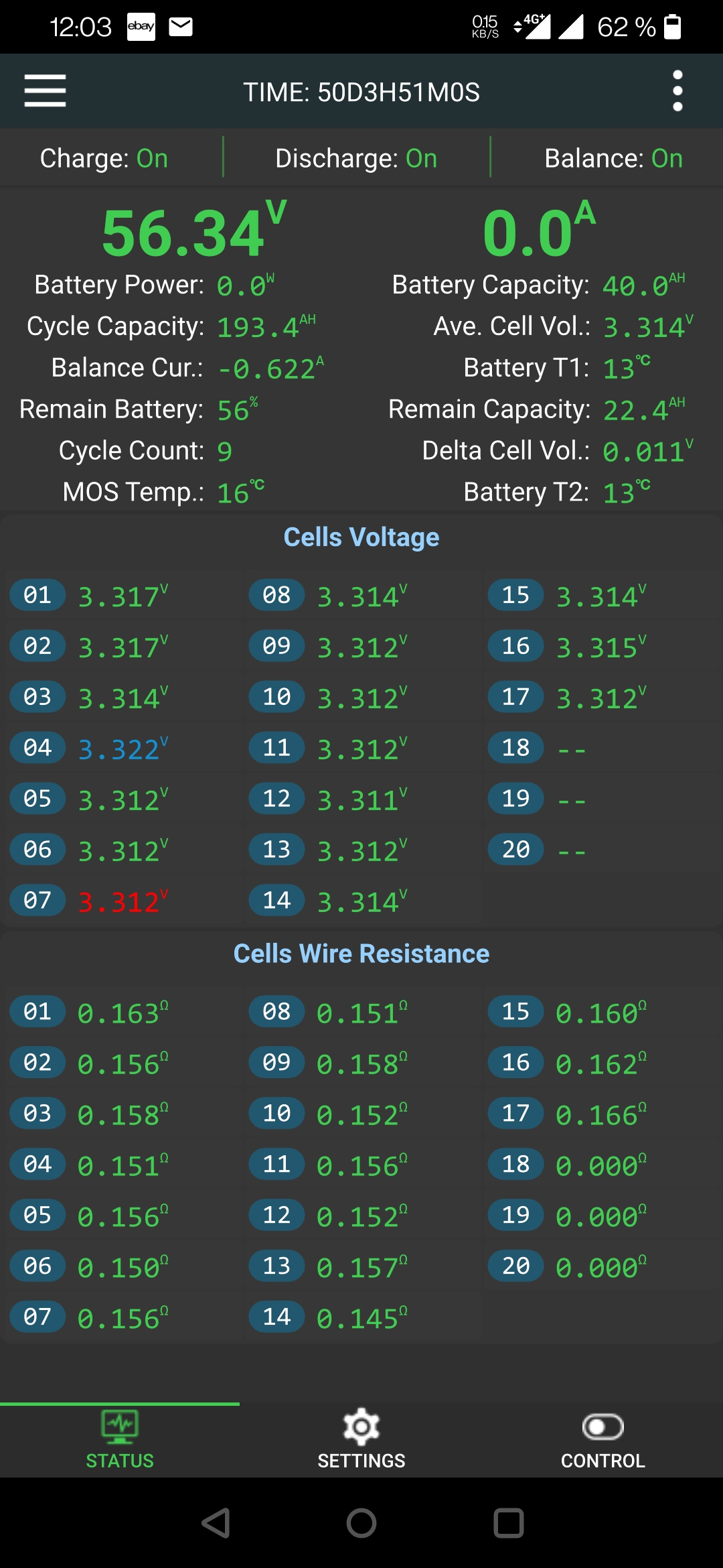 Vermutlich mißt das JK BMS Active Balancer BT mit den Cells Wire Resistance die Innenwiderstände der Zellen. Man kann wohl eine Alterung der Zellen erkennen. Ab 0,75 werden die Zahlen gelb und es geht kaum noch etwas....