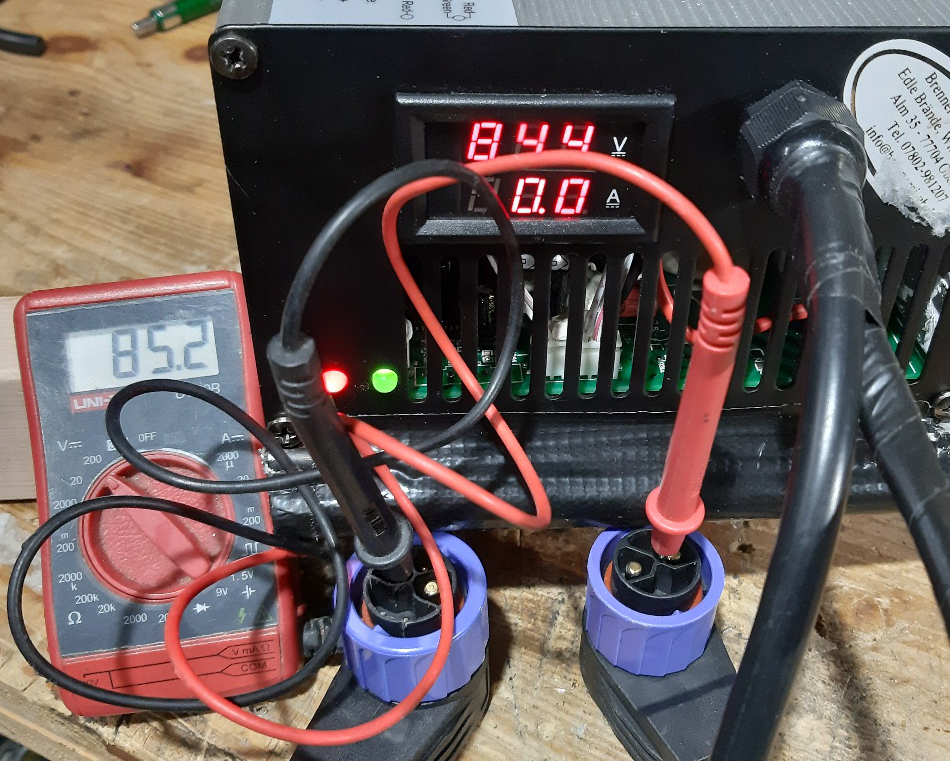 Ich habe herausgefunden, wie man die Akkus ausserhalb der Maschine mit nur einem Ladegerät (15A) gleichzeitig läd.