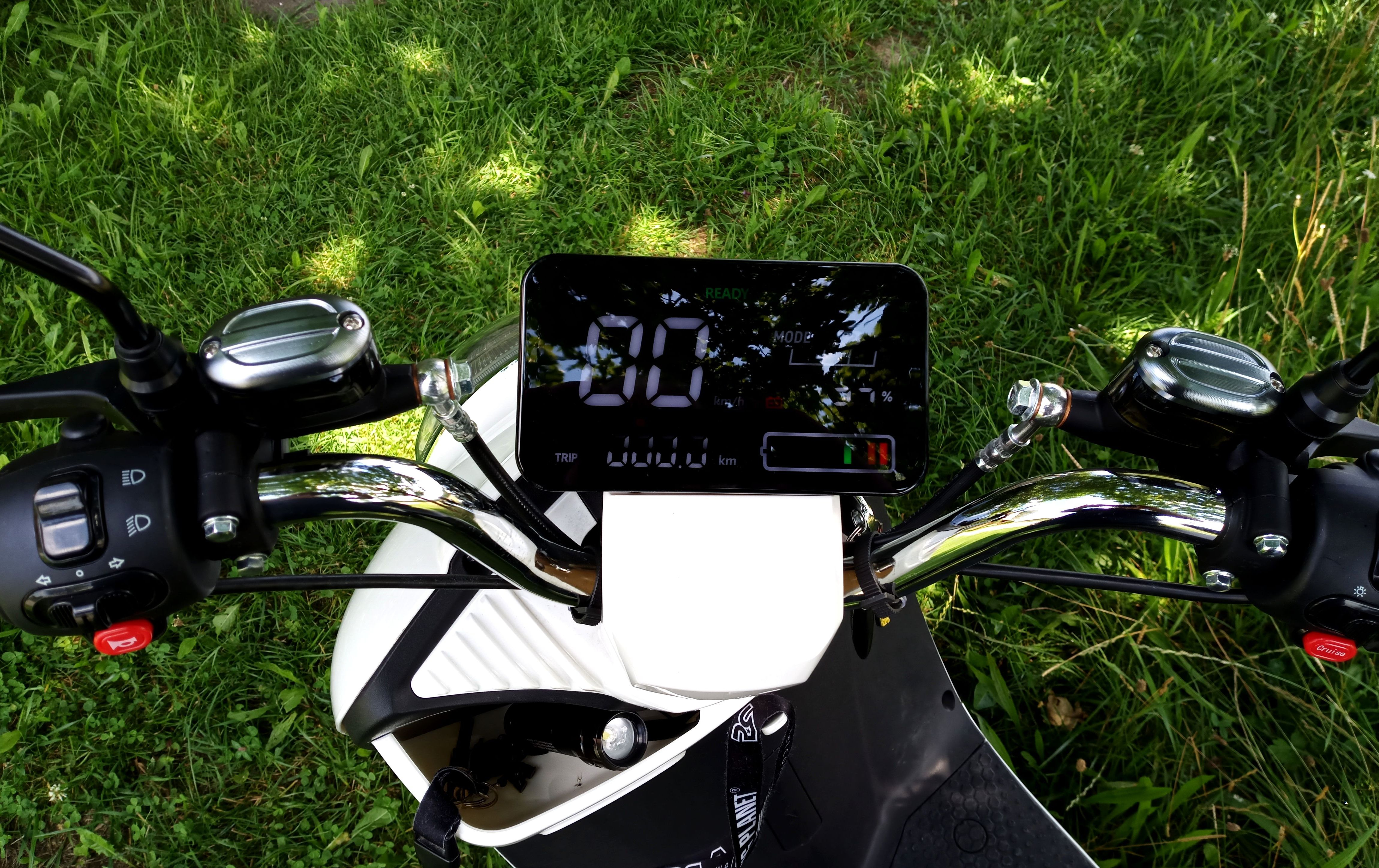 Beim Crystal, alias Elettrico...isses ein zusätzlicher Knopf auf der Gasgriffseite, was ein Umschalten etwas schwieriger macht, wenn man das Tempo ruhig beibehalten möchte.