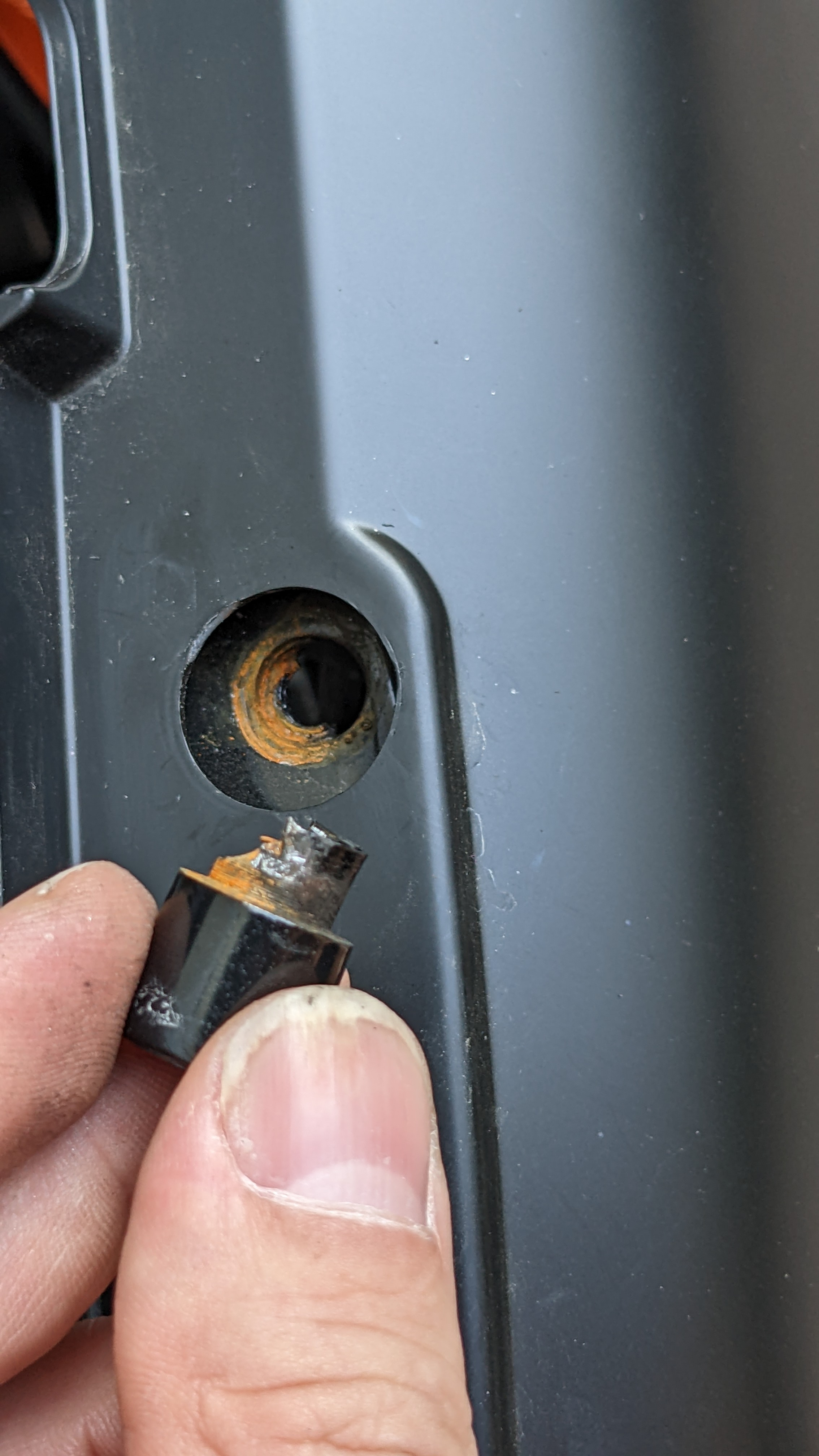 Irgendwann im Sommer fiel mir beim fahren ein klappern und quietschen "von hinten" auf. Die daraufhin folgende Suche hat ergeben, dass sich eine der Gewindehülse, welche zur Halterung des Handgriffs und des Gepäckträgers dient zerlegt hat. Eine auf der anderen Seite war nicht richtig verschweisst und hat sich fröhlich quietschend bewegt. Noch dazu war die zerlegte Hülse verrostet...