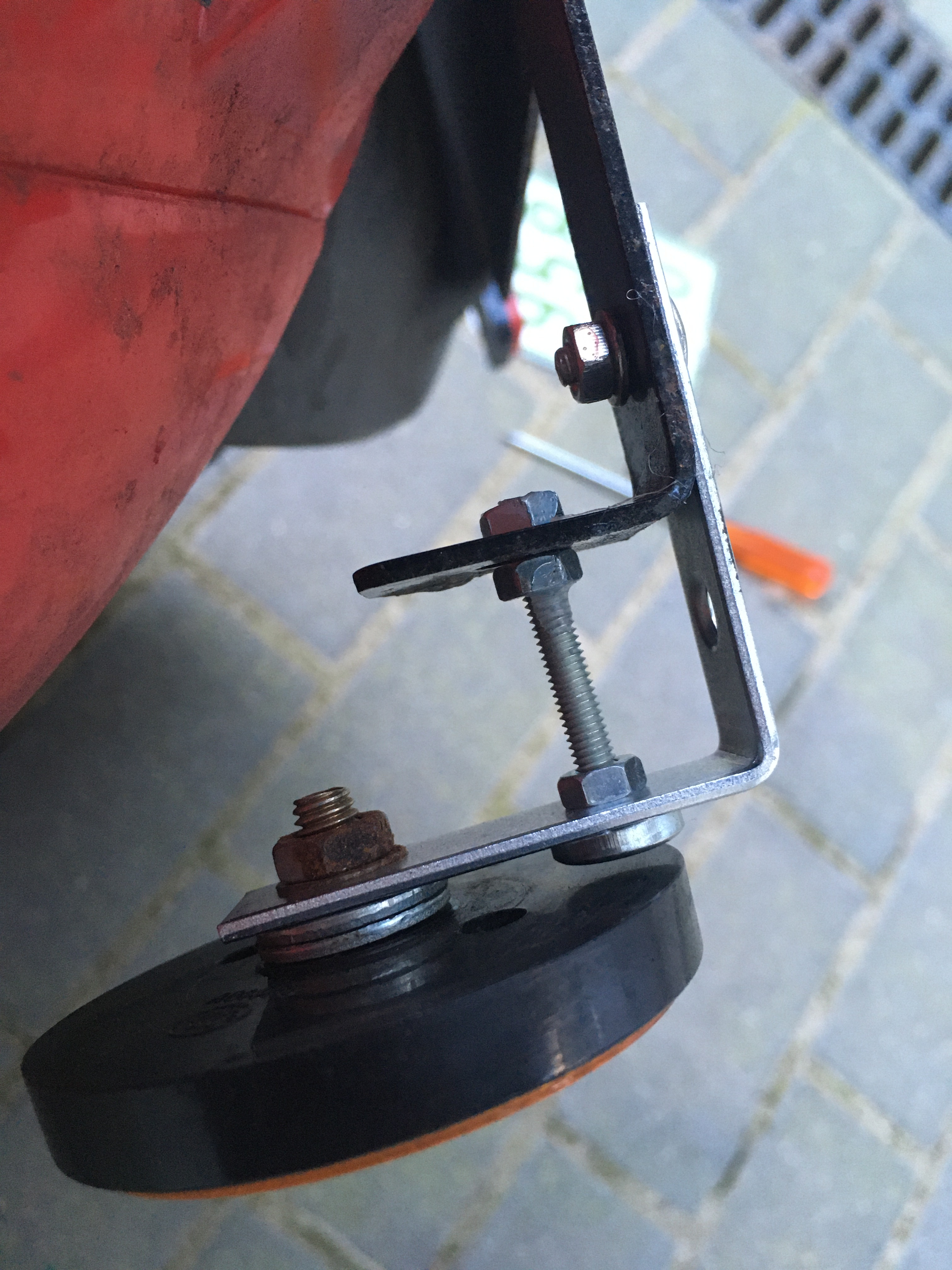 Mit den Winkeln habe ich die Katzenaugen seitlich versetzt, und mit dem Lochband und einem zusätzlichen Loch unten im Schutzblech (Kunststoff) den roten Reflektor nach unten.