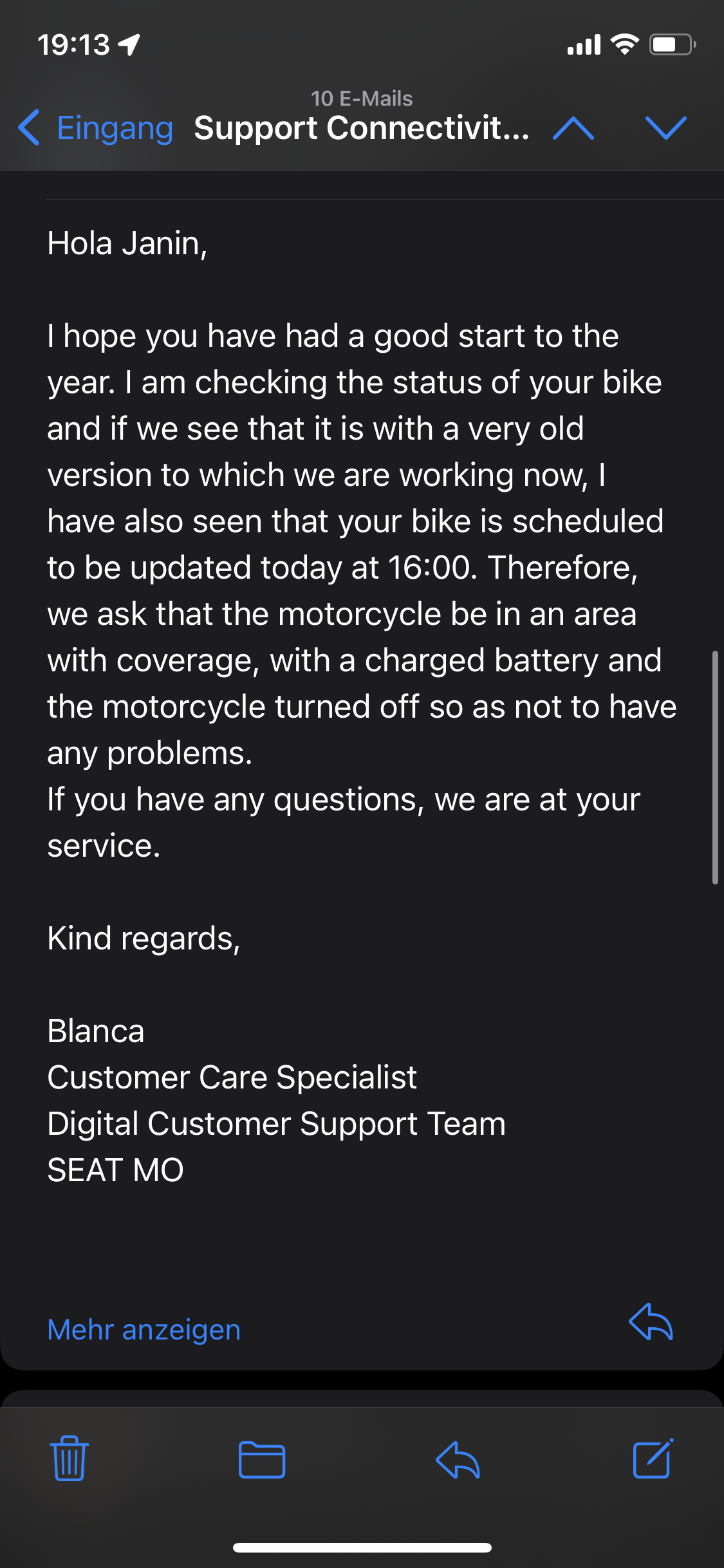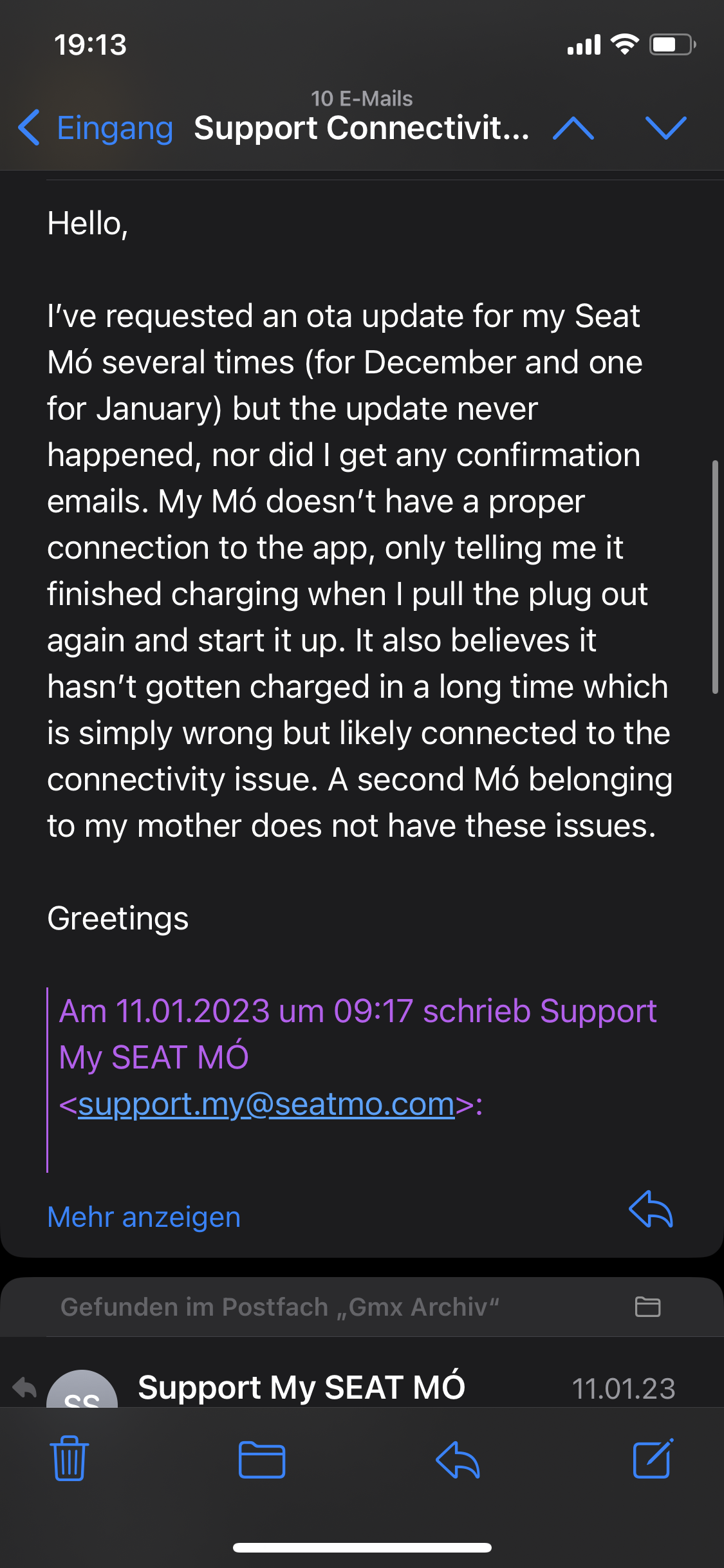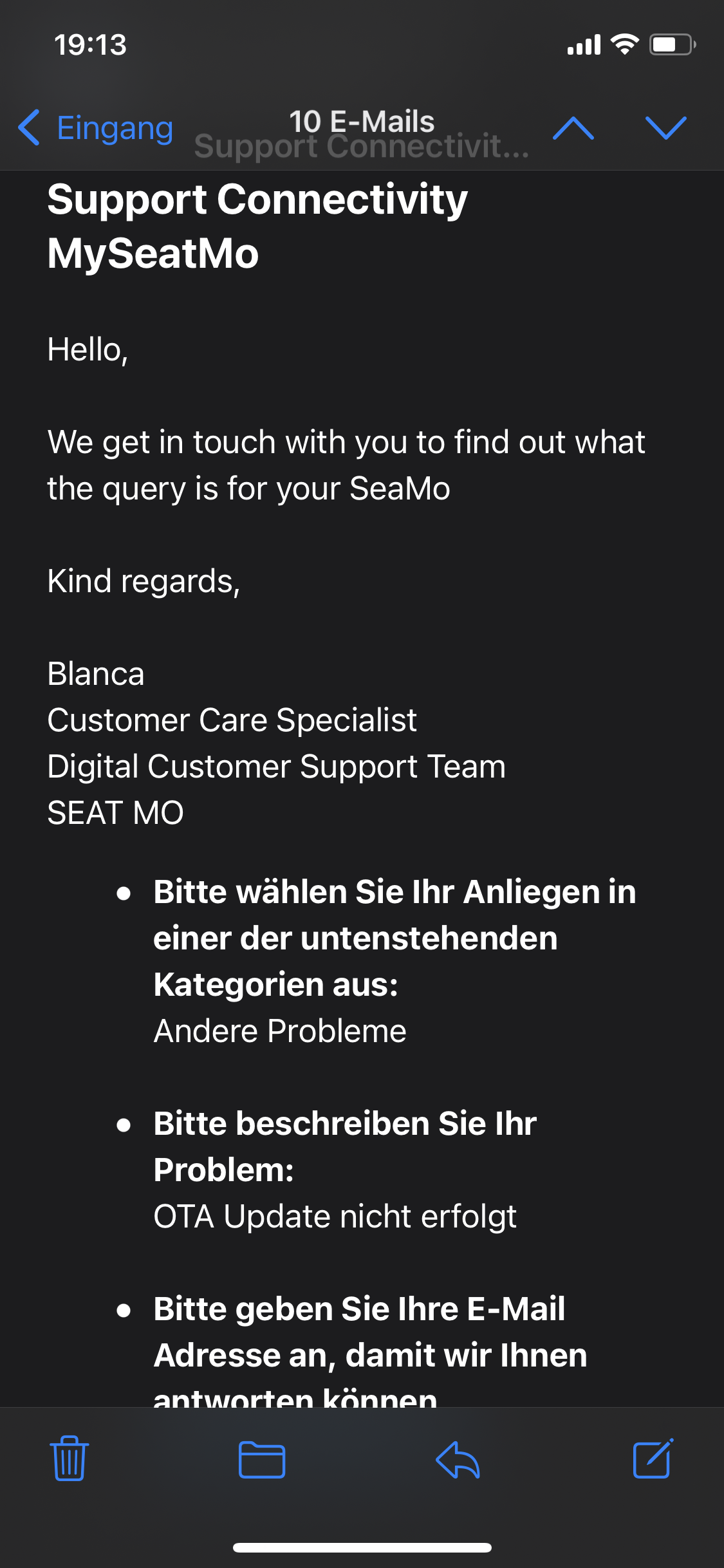 Nachdem die Updates für den Mo meiner Tochter nicht funktioniert haben, hat sie bei Seat (über die App) nochmal angefragt, was dort los ist. Darauf hin folgte dann folgender Mail-Verkehr: