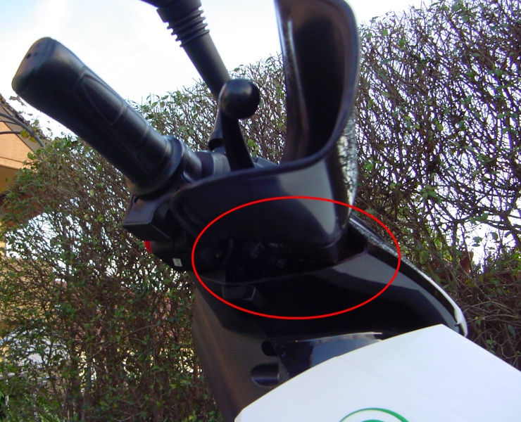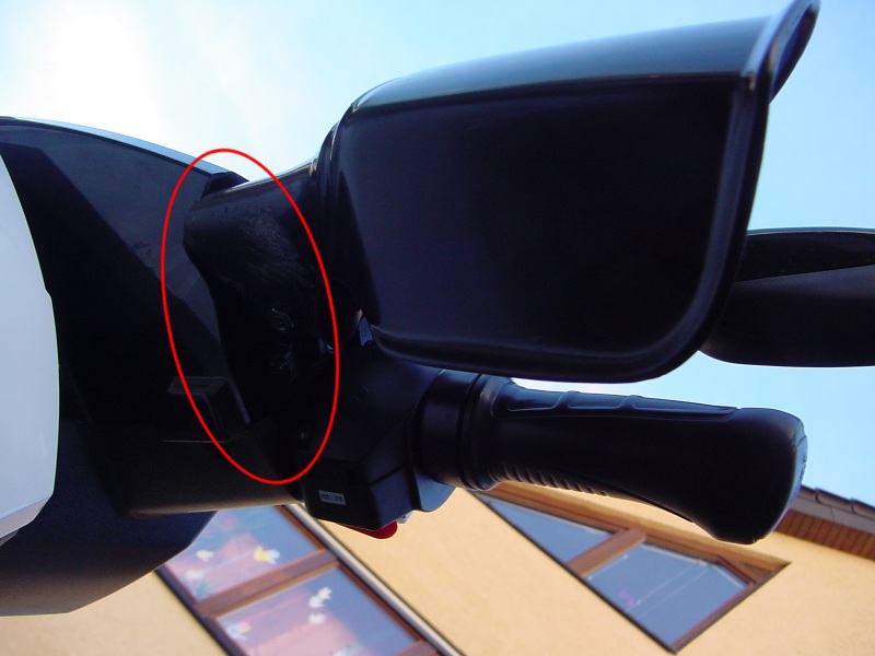 Jetzt kam die viel herausfordernde Aufgabe, die Lenkerverkleidung per Ministichsäge so an ihren Enden zu beschneiden, dass sie den recht ausladenden Wurzeln der Griffschalen genügend Platz ließ und zugleich auch montiert werden konnte. Sieht zwar nicht besonders hübsch aus, wenn man genauer hinsieht, aber es hätte auch schlimmer werden können: Hier noch eine Ansicht von links unten, rot umkringelt der Bereich, den ich unten von der Lenkerverkleidung abnehmen musste: Und hier noch die Ansicht von rechts unten: Insgesamt fehlen links und rechts etwa 4cm von der Lenkerverkleidung. Die Schnittkanten habe ich dann mit schwarzem Permanentmarker wieder eingedunkelt, das Material ist eigentlich weißes ABS.