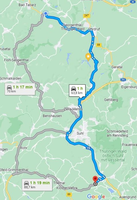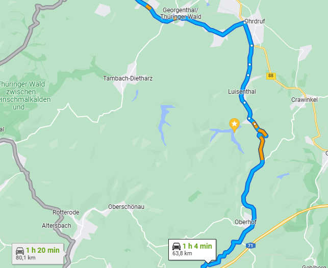 Der Vertragshändler ist 63,8 Kilometer entfernt wobei es auch über richtige Steigungen geht. Von Friedrichroda nach Schleusingen. Durch den Thüringer Wald über Oberhof welches 800 Meter hoch liegt.