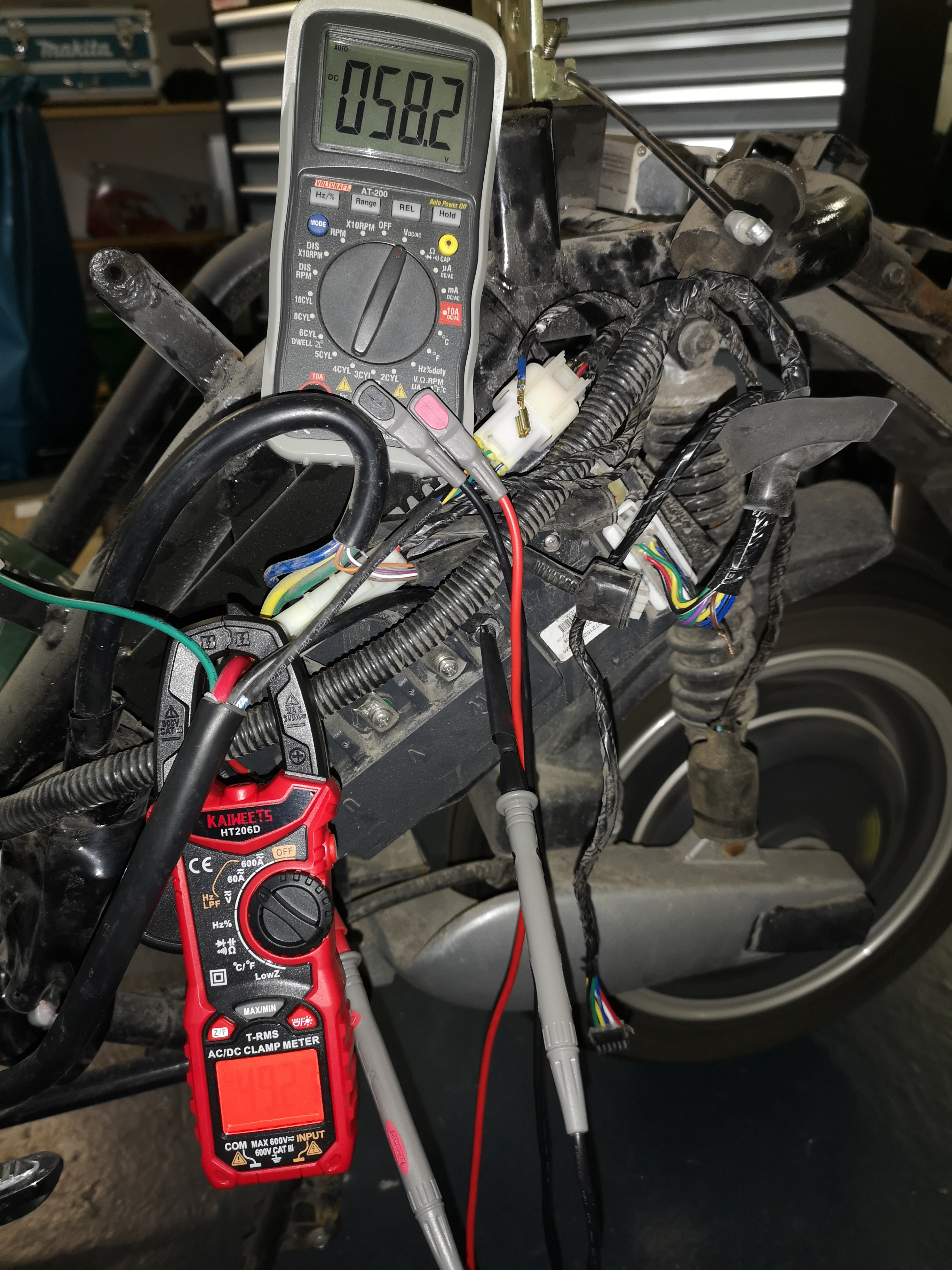 Ohne BMS läuft der Roller. Ich habe ihn aufgebockt und den Bremslichtschalter deaktiviert. Wenn ich ihn bei Vollstrom runterbremse, sinkt die Spannung und die Stromstärke steigt. Bei 50 Ampere und gut 58 Volt schaltet der Controller ab.