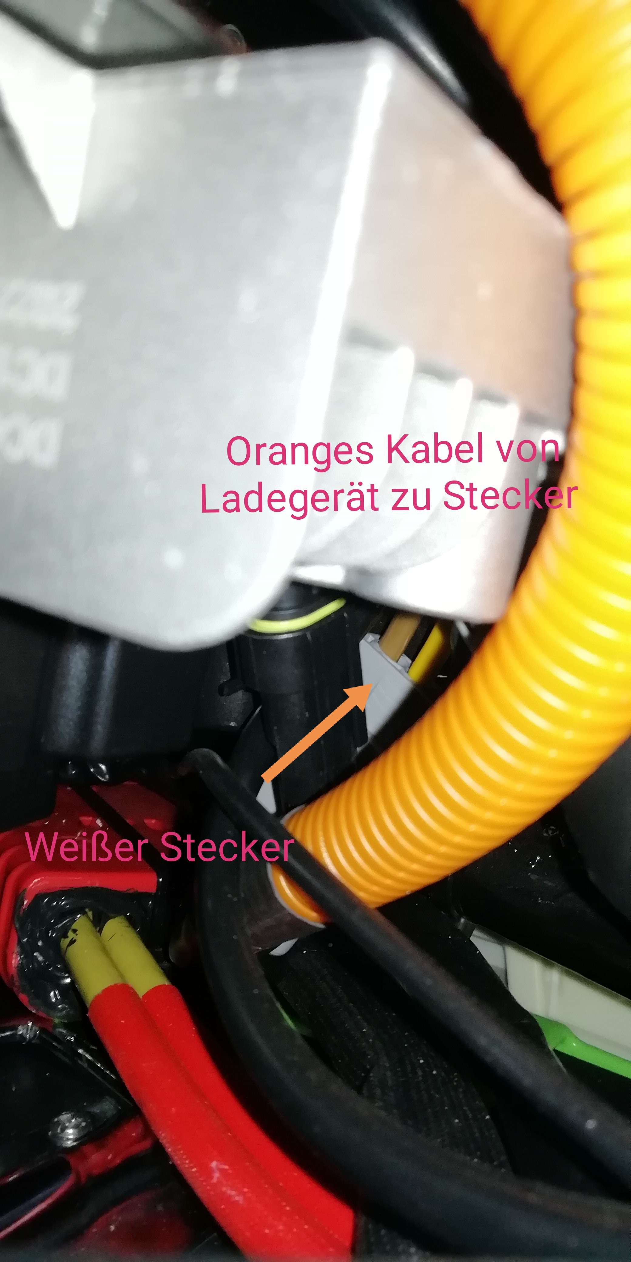 Das Orange Kabel vom Ladegerät geht wohl auf den weißen Stecker im Hintergrund.
