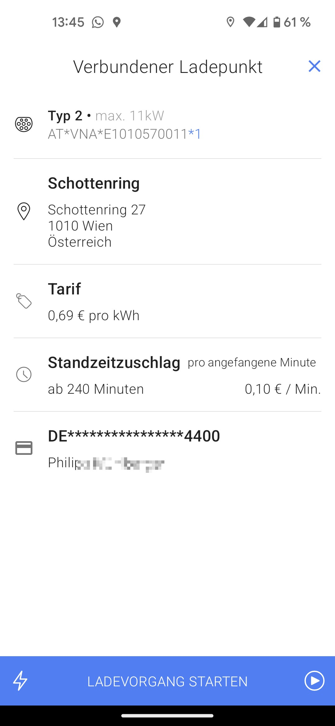 Nein, ich zahle wie im Screenshot und Text beschrieben per kWh, und zwar 65Ct. So einfach ist das. Genau das ist der Vertrag mit dem Ladeanbieter, der die Verrechnung macht. Alles andere spielt keine Rolle. Es gibt eine Blockiergebühr, die in der App definiert ist, wurde oben nicht abgebildet und ist beim CE04 aufgrund von Schnellladen irrelevant. Und man muss nur eine der in der App gelisteten Ladestationen wählen. Sind ja hunderte in Wien.