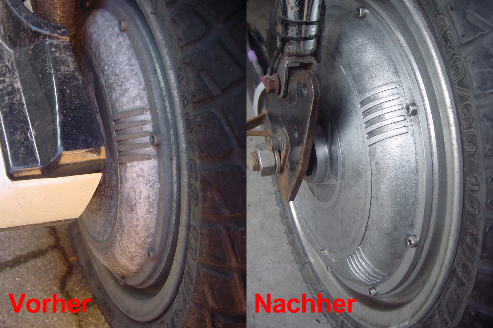 Wenn man das Bild in voller Größe anguckt (draufklicken) sieht man, dass die Korrosion so tief war, dass trotz den teils noch sichtbaren Drahtbürstenkratzern nicht ganz alles wegging. Nun ja, was schon oxidiert ist wird nicht mehr weiteroxidieren können, unter den 5 Lackschichten.