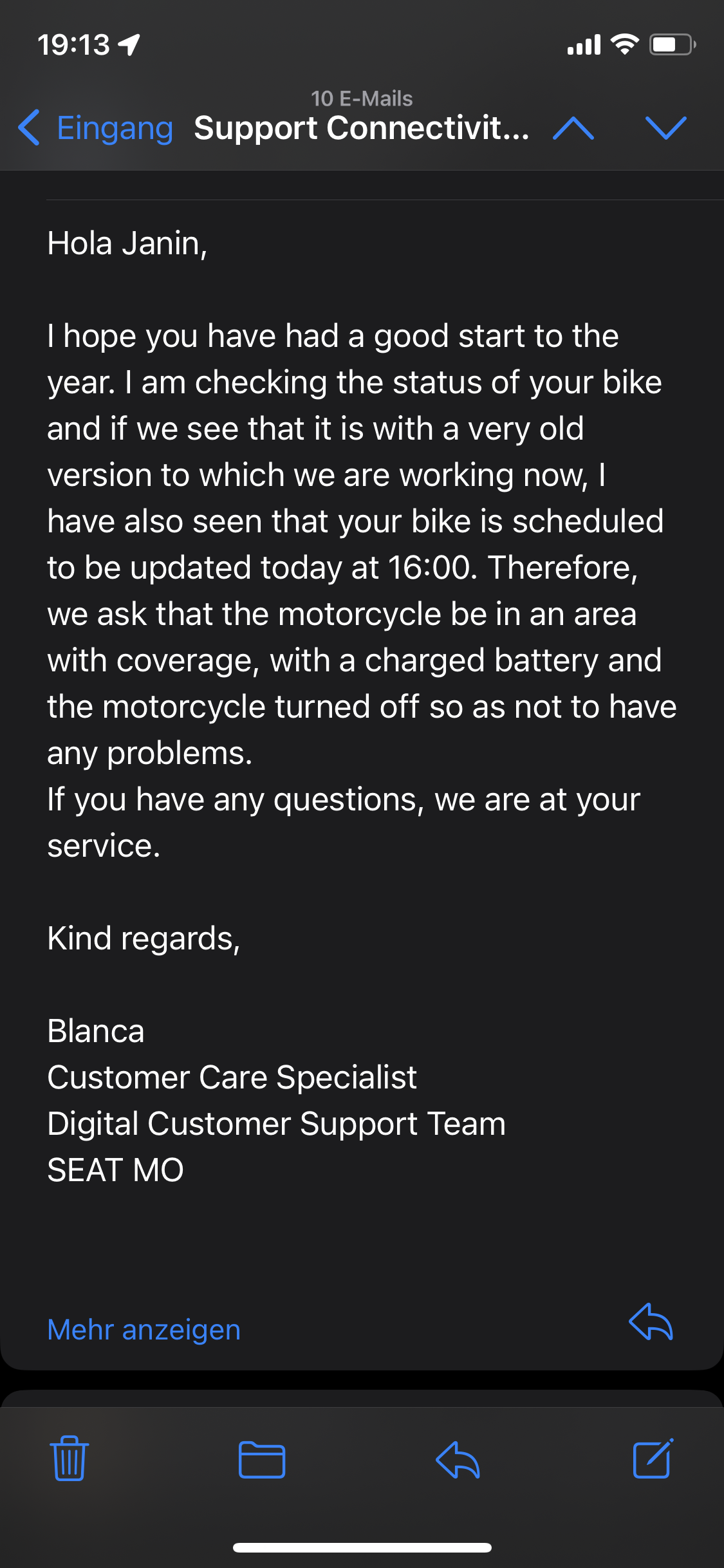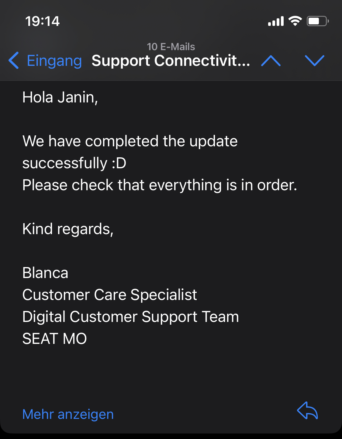 Nachdem die Updates für den Mo meiner Tochter nicht funktioniert haben, hat sie bei Seat (über die App) nochmal angefragt, was dort los ist. Darauf hin folgte dann folgender Mail-Verkehr: