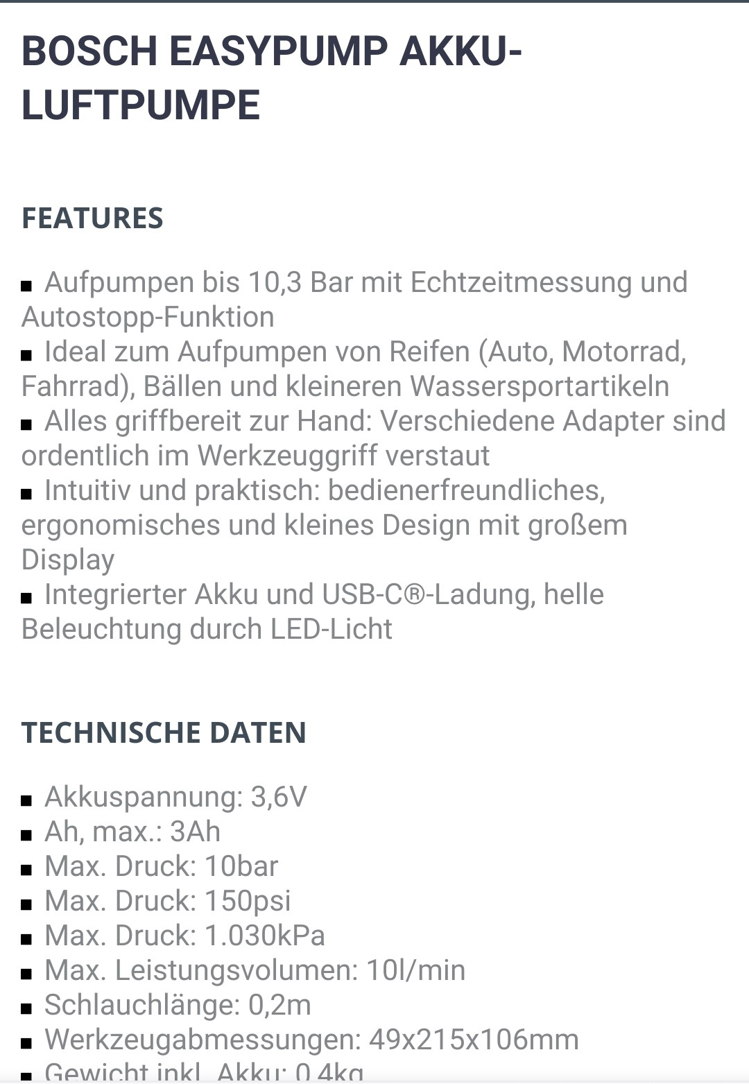 das ist die Aukkuluftpumpe von Bosch für 64€ ( eigendlich teuer, aber ich brauchte sie gleich und nicht in 5 - 50 Tagen ). Das Manco ist das beim Auf / Abschrauben auf das Autoventil / Paulventil Luft entweicht. Ich gehe wie folgt vor, Aufsatz etwas aufschrauben auf das Ventil, Pumpe anstellen und weiter aufschrauben ( Tasächlicher Luftdruck wird dann angezeigt ) Beim Abschrauben lasse ich die Pumpe laufen und der Luftdruck wird dann so gehalten. Passt für mich. Der Akku hält für den Paul / Fahrrad Motorroller gut durch, aber beim Aufpumpen von vier Autoreifen nicht, aber dafür hat man dann andere Pumpen. Gute Fahrt