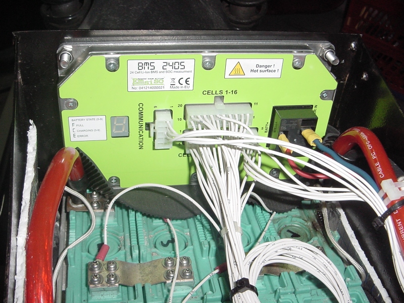 Das BMS ist innen an die Rückwand des Batteriekastens geschraubt, und die beiden Kabel vom Ladegerät zur Batterie führen zur Zeit direkt ins BMS. Jetzt wird es spannend, ob es mir endlich gelingt, den Minuspol vom BMS zur Batterie zu finden und wieder über den Shunt vom Cycle Analyst zu führen, so dass ich endlich wieder den Ladestrom richtig messen und überwachen kann. Ebenso werde ich mich morgen auf die Suche nach dem zur Zeit "verschollenen" Minuspol zum "Zünd"schloss und DC-DC-Wandler zu finden, der ebenfalls wieder über den Shunt laufen sollte, denn die durchschnittlich 2A für die Beleuchtung sind nicht ganz zu vernachlässigen, vor allem bei Staufahrten, wie sie zur Zeit wieder häufiger auftreten.