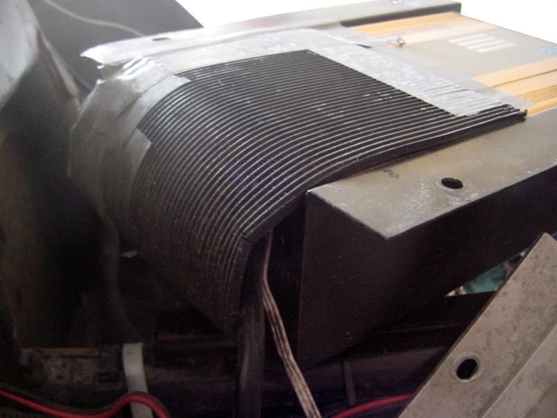 Noch ein interassenter und offensichtlich sehr wirkungsvoller Ansaugschutz der Kühlung vom Ladegerät. Der Ventilator saugt von vorne die Luft an, so dass womöglich dort reingesprühte Gischt zu manchem vorzeitigem Ladegerätetod in meinem Roller geführt haben könnte. Der E-Sprit Techniker hatte bei der Generalrevision daher einen Ansaugrüssel vorne ans Ladegerät gebaut, aus Gummimatte und Panzeklebeband. Hier die linksseitige Ansaugöffnung: