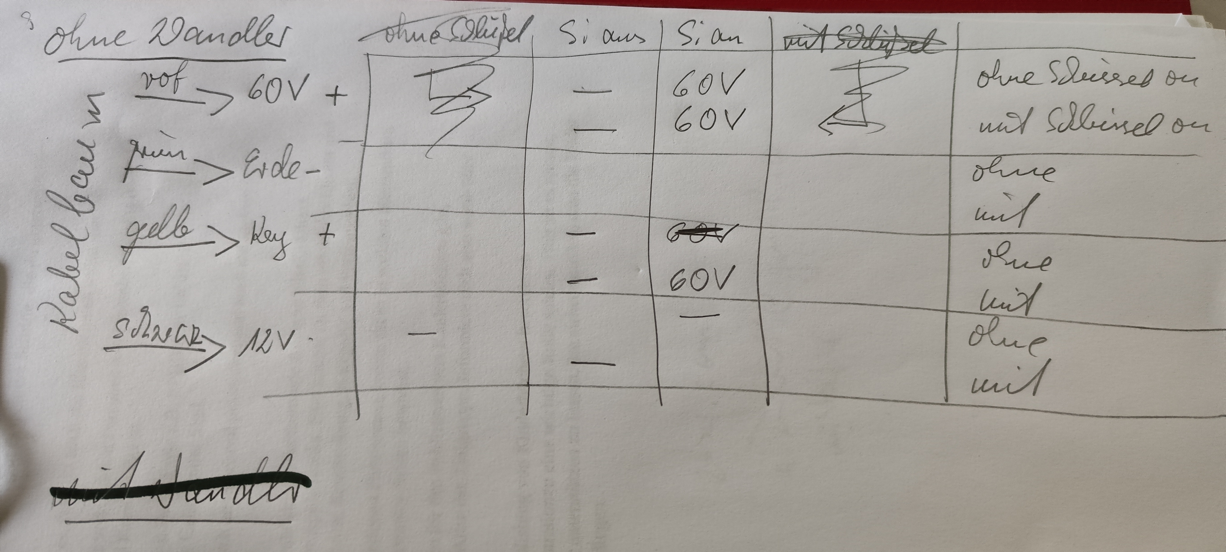 Hier das Bild um zu sehen, was für Spannungen am Kabelbaum vor dem Wandler anliegen. Mit Sicherung ist die Hauptsicherung gemeint.