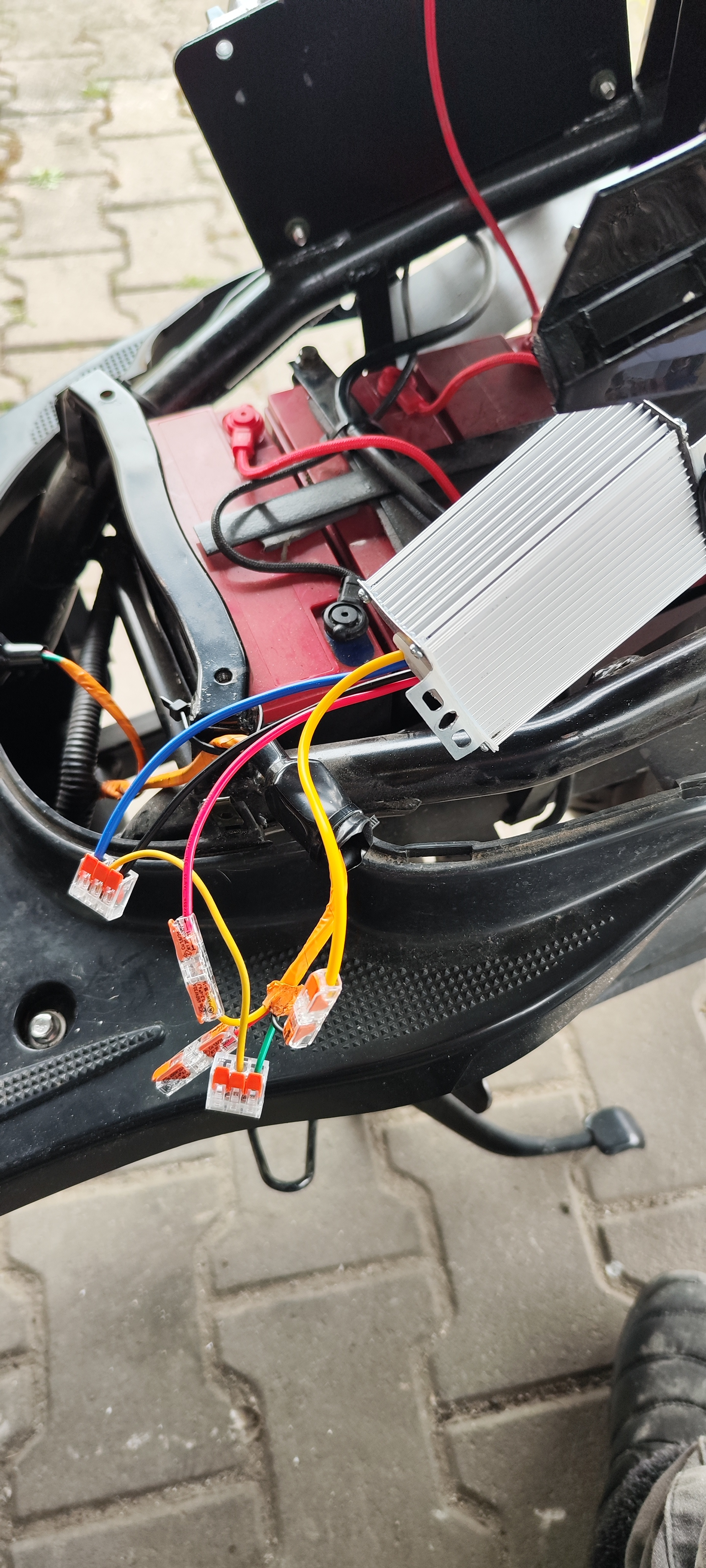 Da bin ich wieder nach einiger Zeit. Der Roller stand in der Garage. Ich dachte ja der gewechselten Wandler hätte es gefixt. Das Licht vorne brannte ja auch wieder. Als ich am Abend den Erfolg mit einem Bierchen feiern wollte bemerkte ich, Rüch-und Bremslicht gehen nicht. Die Winker auch nicht. Dachte zuerst, ich hätte die Kabel nicht richtig angeschlossen. Die Chinabelegung war ja von den Farben völlig anders. Funzte aber alles nicht! So wanderte die Möhre erst einmal in den Schuppen. Nun habe ich gestern den ganzen Tag damit zu gebracht zu messen, anzuschließen und wieder zu messen. Alles ohne Erfolg, obwohl ich von Klugscheißenden Nachbarn umgeben war. Wenigstens hatten sie Bier mit gebracht. Und jetzt kommt der Tipp für andere mit dem gleichen Fehler. Da sagt doch der Nachbar mit dem Bier, vielleicht sind die Birnen kaputt. Konnte ich mir nicht vorstellen. Alle auf einmal? Aber Kontrolle und tatsächlich. Alle vier Blinkerbirnen, Brems und rücklichtbirne waren alle durch. Die Sicherung an der Motorelektronik war ja damals auch durch. Als damals der Wandler seinen Geist aufgegeben hatte muss wohl eine mächtige Spannung auf die Birnen gewirkt haben. Birnen gewechselt und jetzt geht wirklich alles wieder. Übrigens der China Wandler für 12 Euronen bringt 25A, der alte nur 10. Da wäre noch ne Sitzheizung drin...