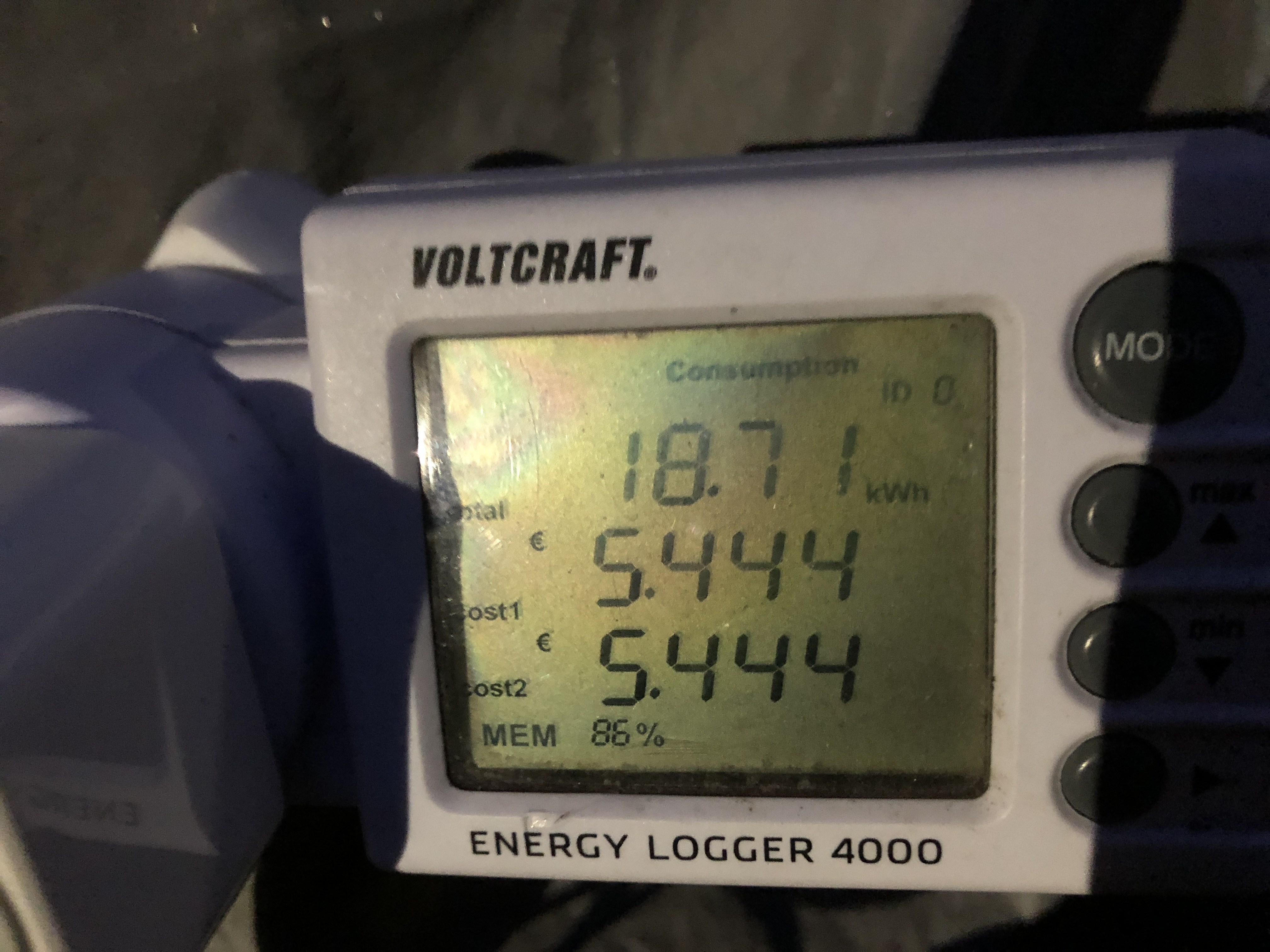Zuhause hätte ich so ein Adapter von FRITZ!Box, der misst die Verbrauchte Energie UND schaltet ab wenn der Akku voll ist. Aber das Ding hat kein Display, kann es also auf Arbeit nicht benutzen.