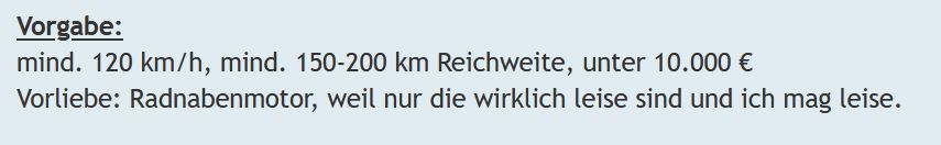 (…und nein, damit war nicht gemeint, dass das Mopped mind. 150 km weit 120 km/h fahren soll!)