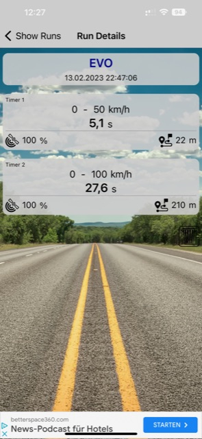 Hallo, danke für eure Meinungen. Im Anhang einige Versuche eines 0 bis 50 kmh Beschleunigung mit race timer. Ein paar Versuche haben sicher nicht ganz richtig funktioniert. Die Höchstgeschwindigkeit muss ich erst testen.