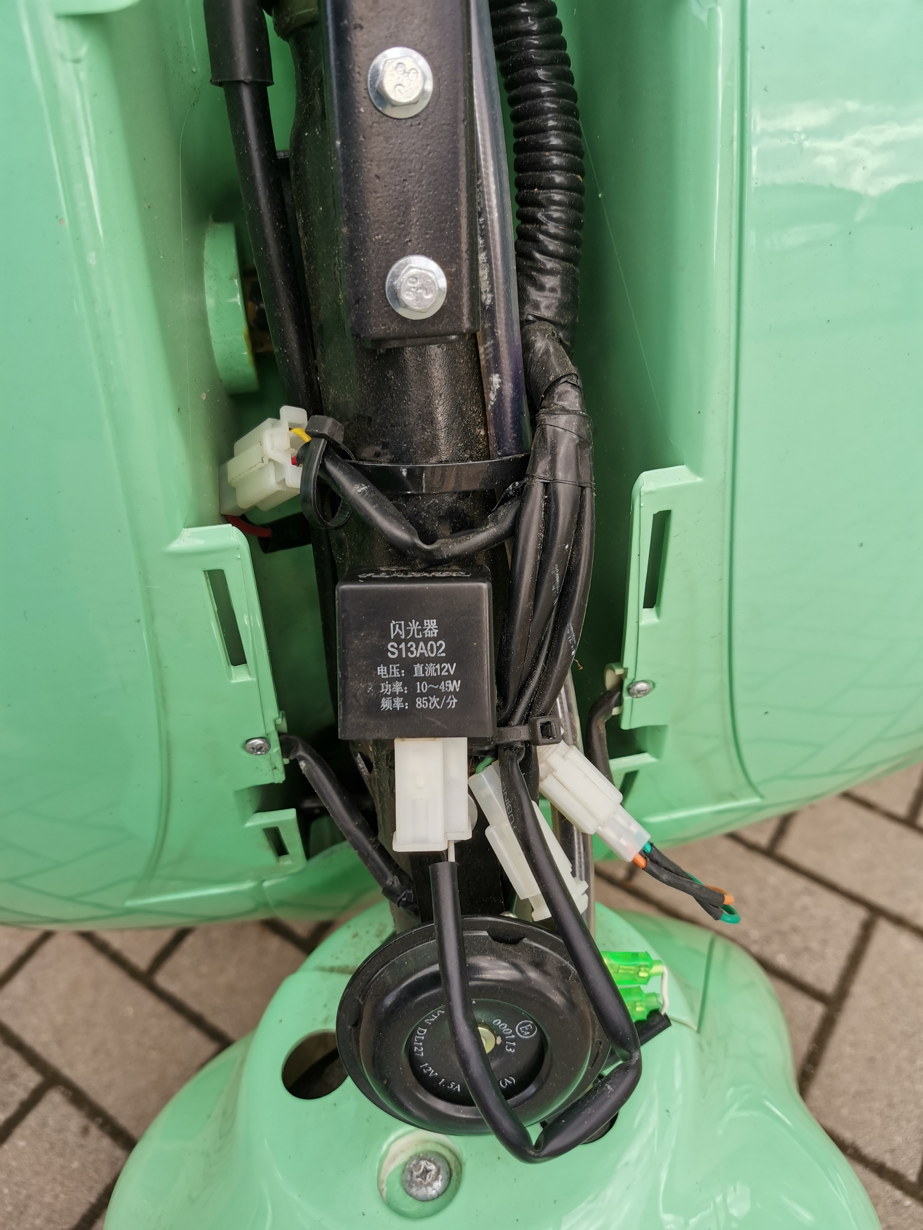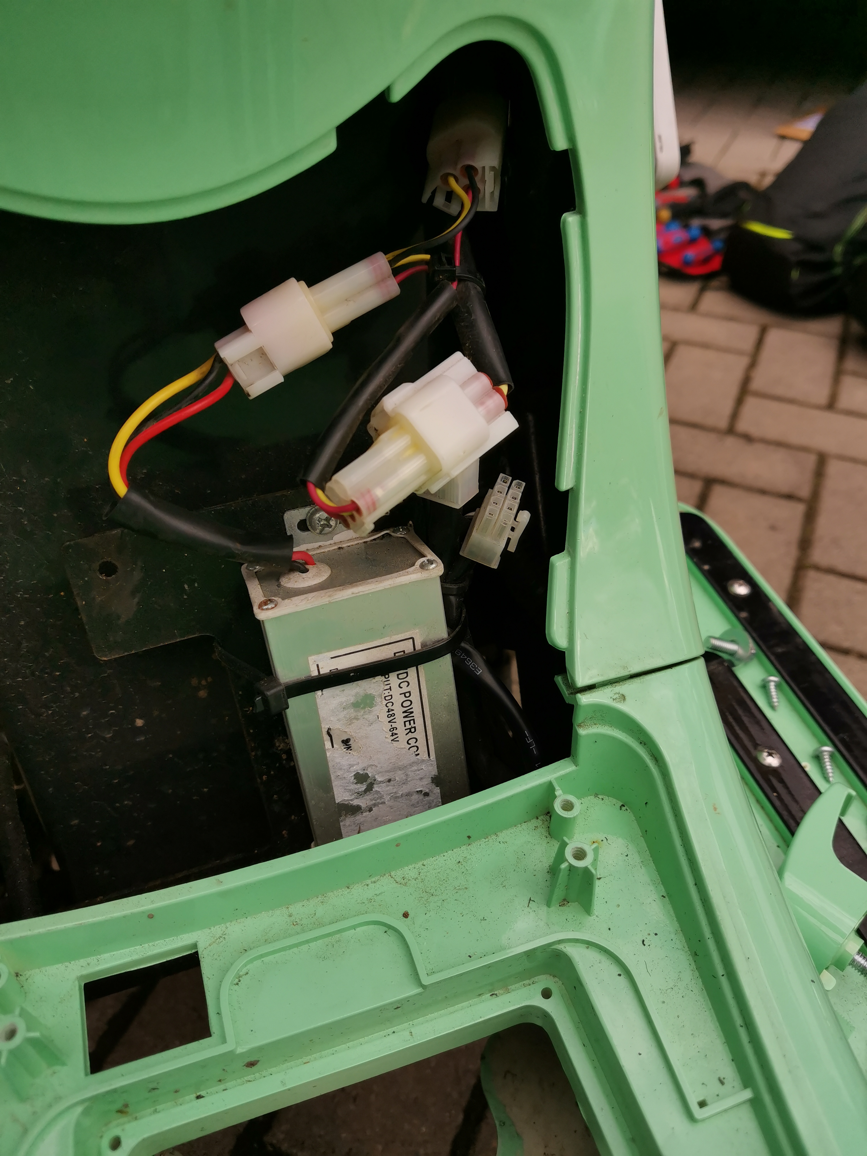 Leider ist es schwierig, die Spannung an den Steckern zu messen, Interessant wäre, ob der DC-Converter funktioniert. Gelb müsste die Akku-Spannung B+ sein, die vom Zündschloss kommt. Rot wäre dann 12V. Da hängt die ganze Versorgung Licht, Blinker, Hupe dran. Schwarz ist die gemeinsame Masse Gnd.