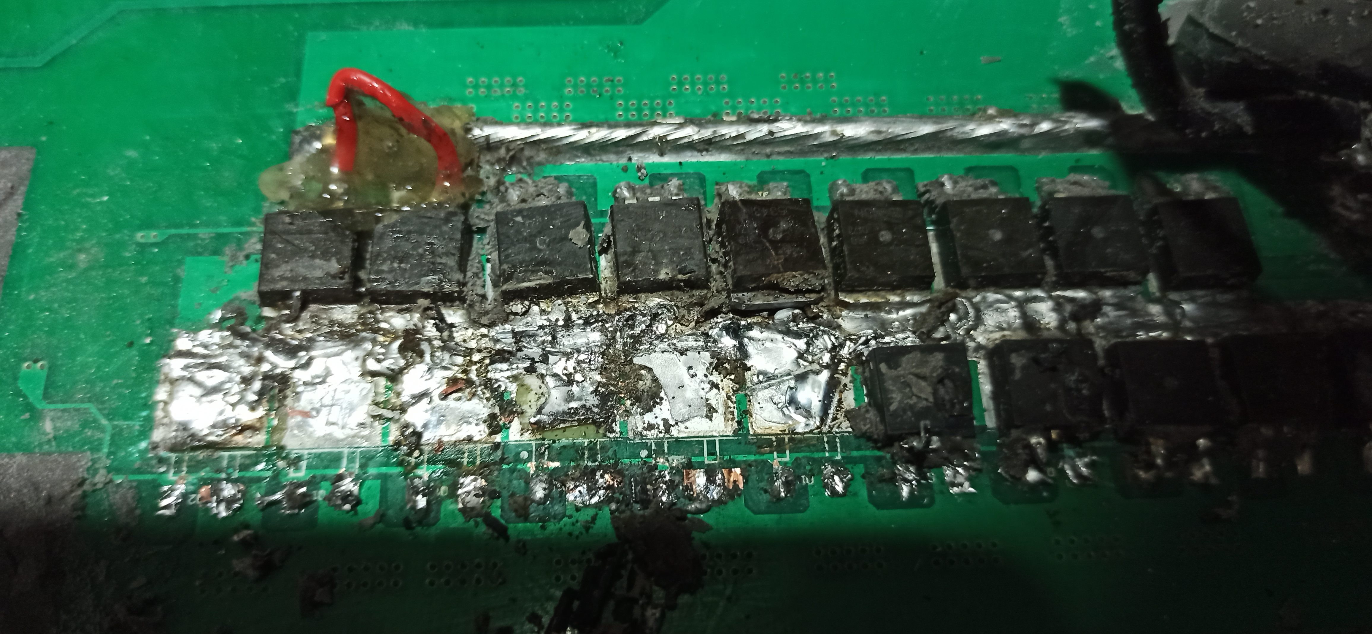 You have bridged the FETs with solder over the traces between source and drain. So it may work with no or little load.
