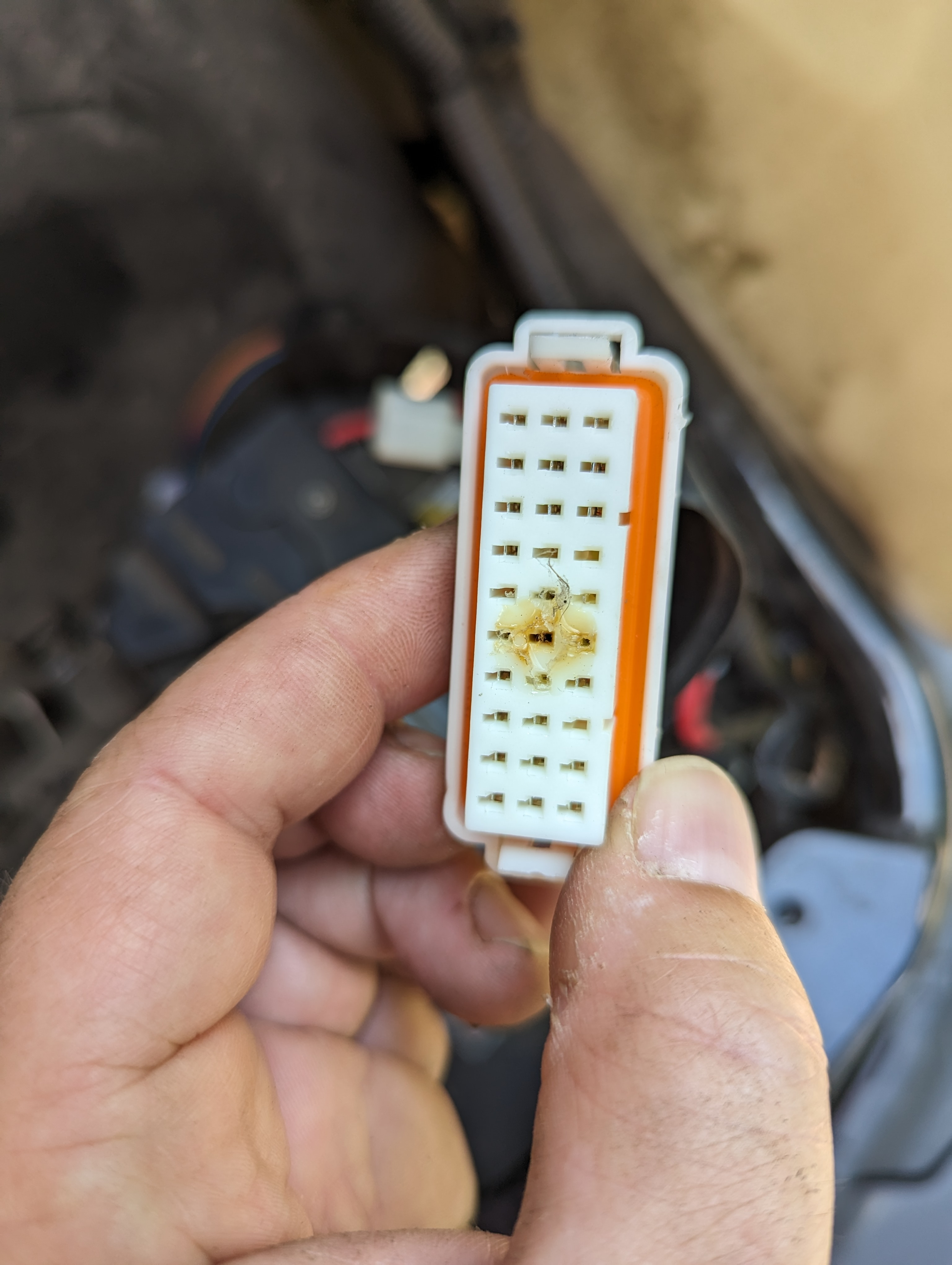 Beim Stecker sieht man, das die Vergussmasse durch einen Übergangswiderstand bzw. zuviel Strom geschmolzen ist.