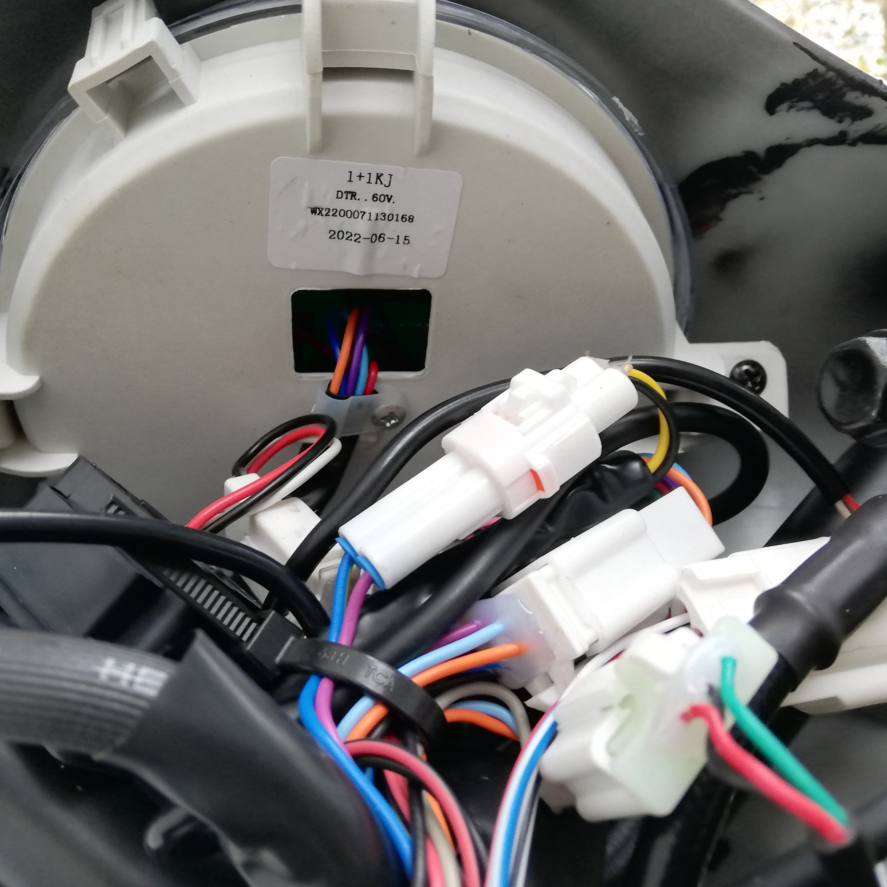 Abblendlicht/Fernlicht von hinten: Verkabelung hinterm Lenker. Oben das Display mit Platine Nahaufnahme Display von vor dem Lenker Displayglas: Platine von innen Wenn ich die Platinenbeschriftung durch Google Translate jage sagt er mir Folgendes für die Adernfarben: