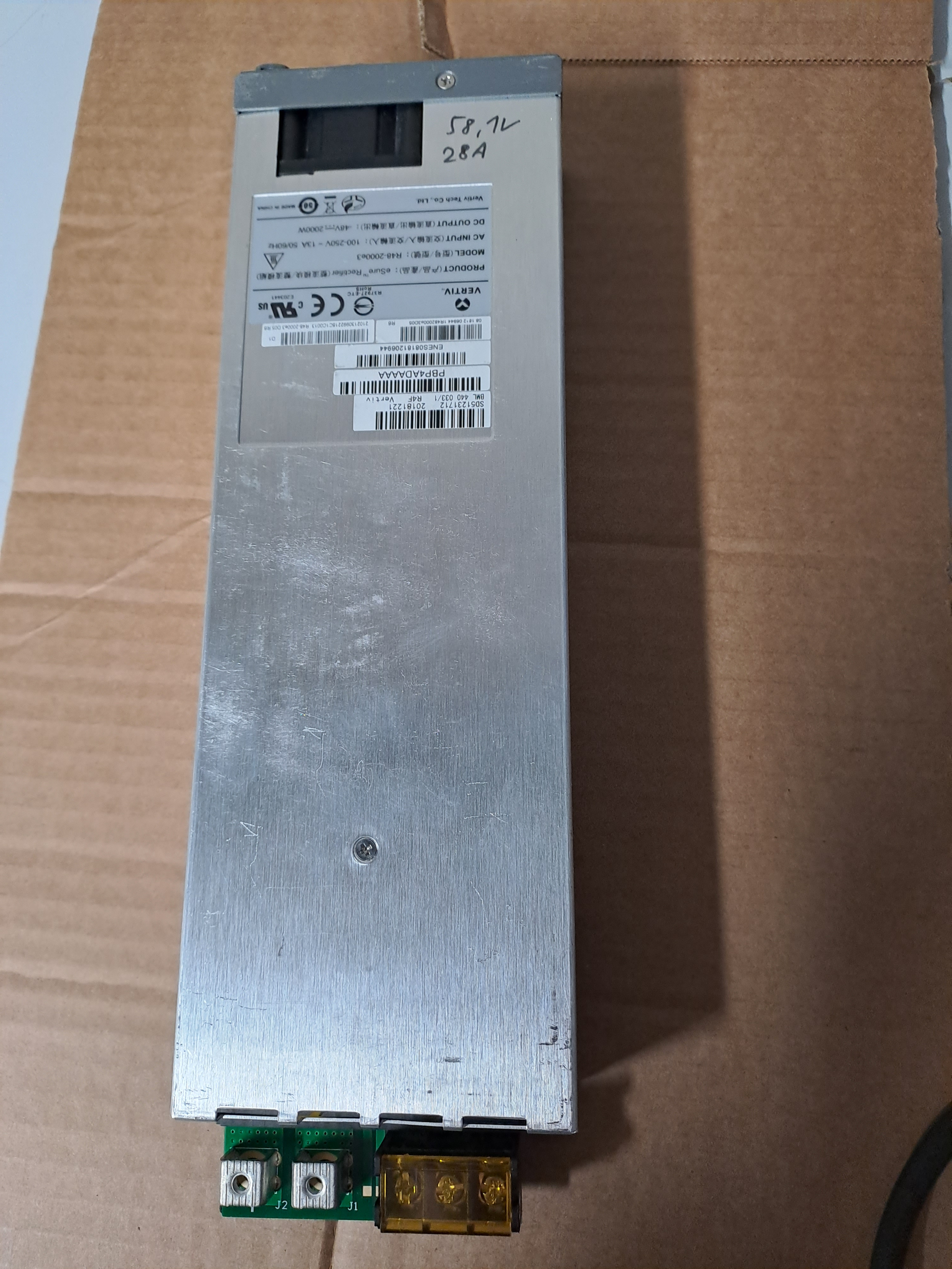 Die Emerson Vertiv R48-2000E3 lmit 1,13kg bei 41x82x252mm, lssen sich bis 41,5V runter programmieren, dann zwei in Reihe schalten macht dann einstellbare 83 -117V bei maximal 42A Ladestrom pro 2er Pack. Und das dann dreimal gür drei Phasen. Gibt dann gut 120A Ladestrom. Das Lüftergeräusch bei unter 42V ist dabei dann aber sehr deutlich hörbar.