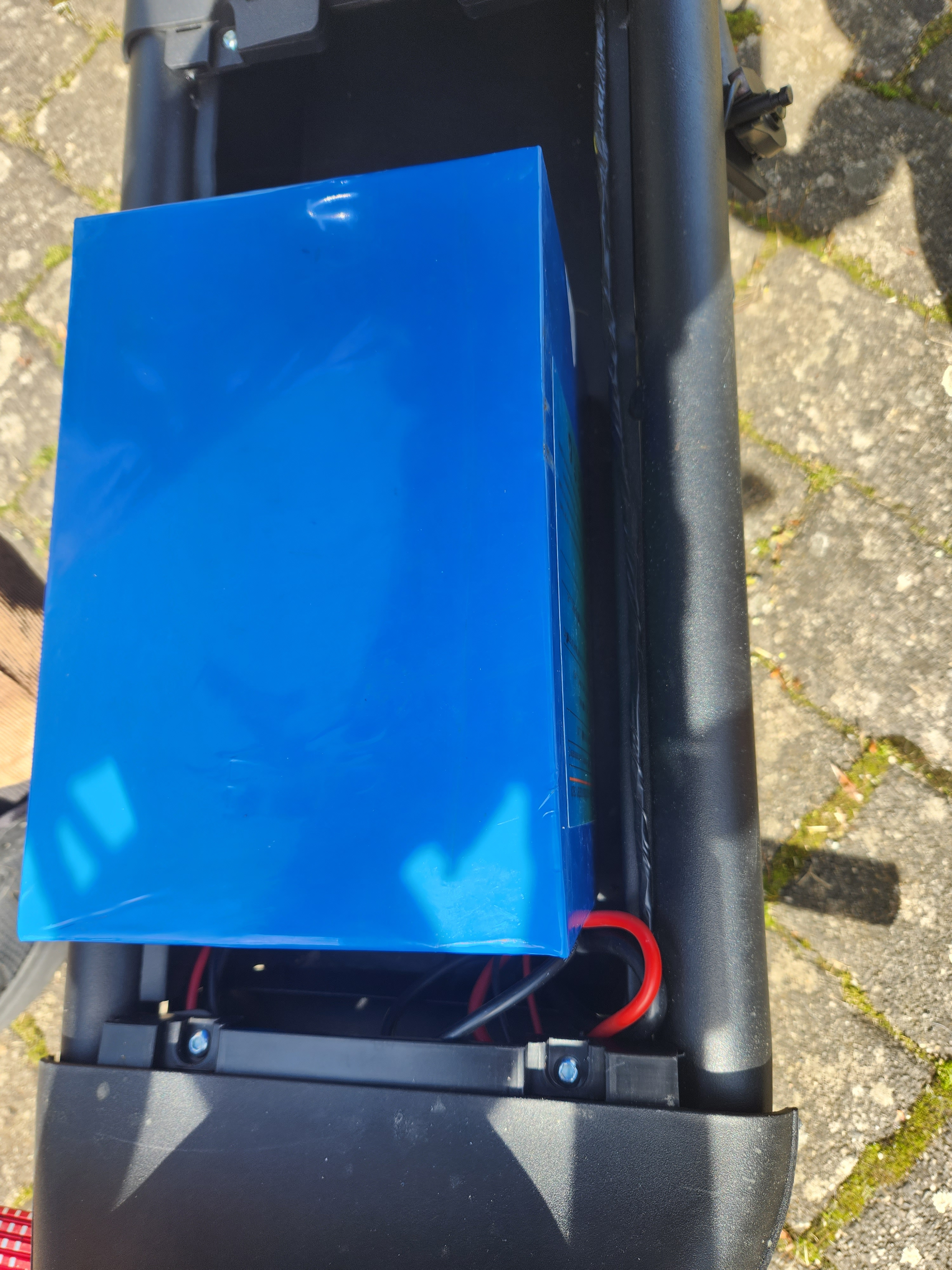 Vielleicht kommt er in einen Seitenkoffer, mit einem Zweiten von dem selben Akku, damit dann beidseitig das Gewicht verteilt, ein Akku von denen wiegt 15 Kilo.