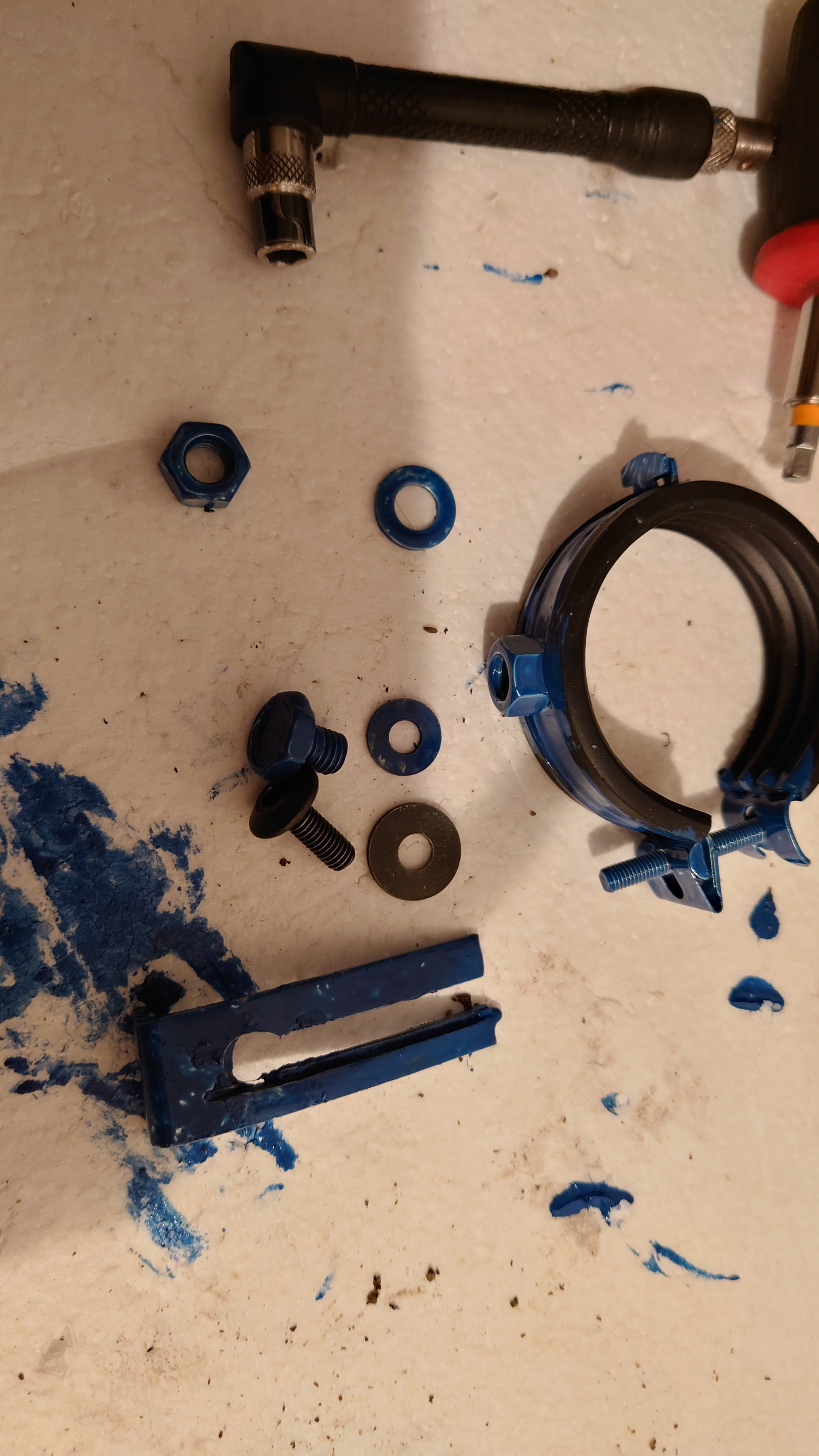 Hab das jetzt mit einer 48mm Rohrschelle, einen Blech und ein paar Dingen festgemacht. Am Ende nicht geil aber hält.