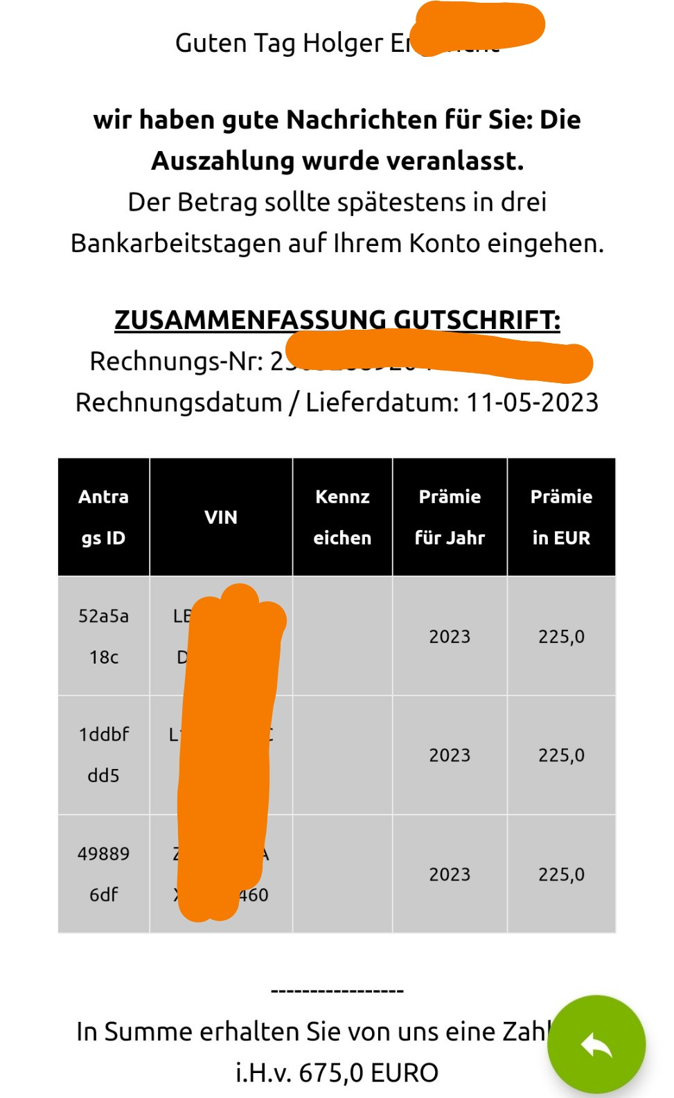 Elektrovorteil hatte mir am 8.April eine fixxe Zahlung von 225 € pro Fzg angeboten, das habe ich doch gestern Abend noch akzeptiert 😎.