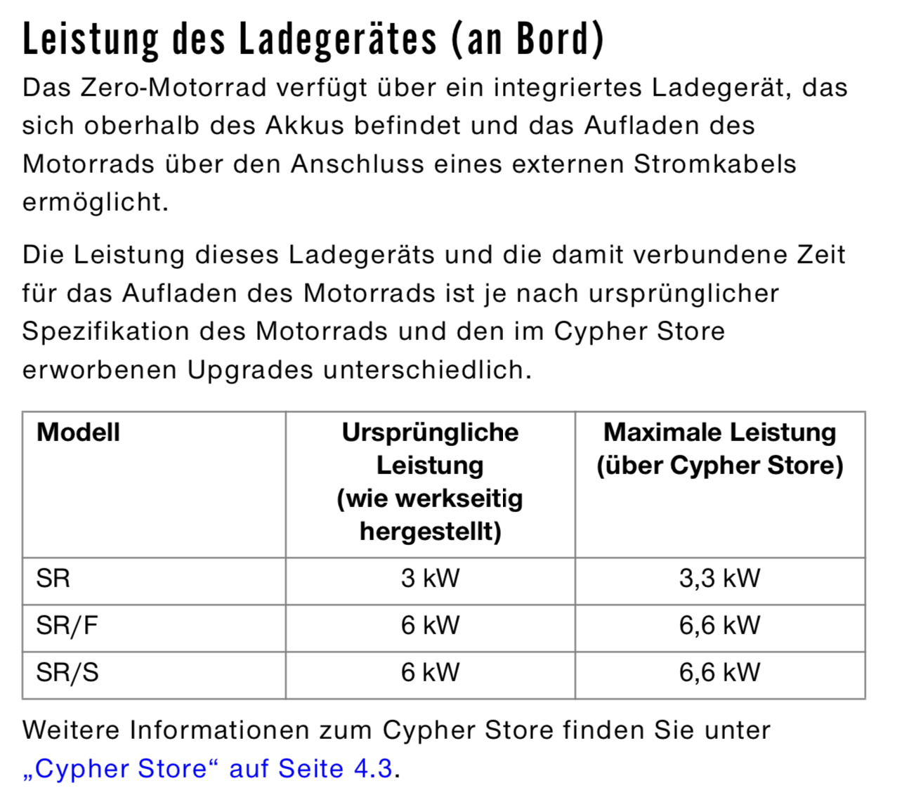 Normal hat die SR/S bzw. SR/F Reihe einen 3kw Lader.MEroller hat geschrieben: Do 18. Mai 2023, 19:59 Habe es gerade nochmals studiert: Die SR/S hat serienmäßig schon 6,6kW Ladeleistung, weitere 6,6kW gibt es aber nur optional, wenn man nicht auch den PowerTank will. Die Teilen sich also weiterhin den Platz.