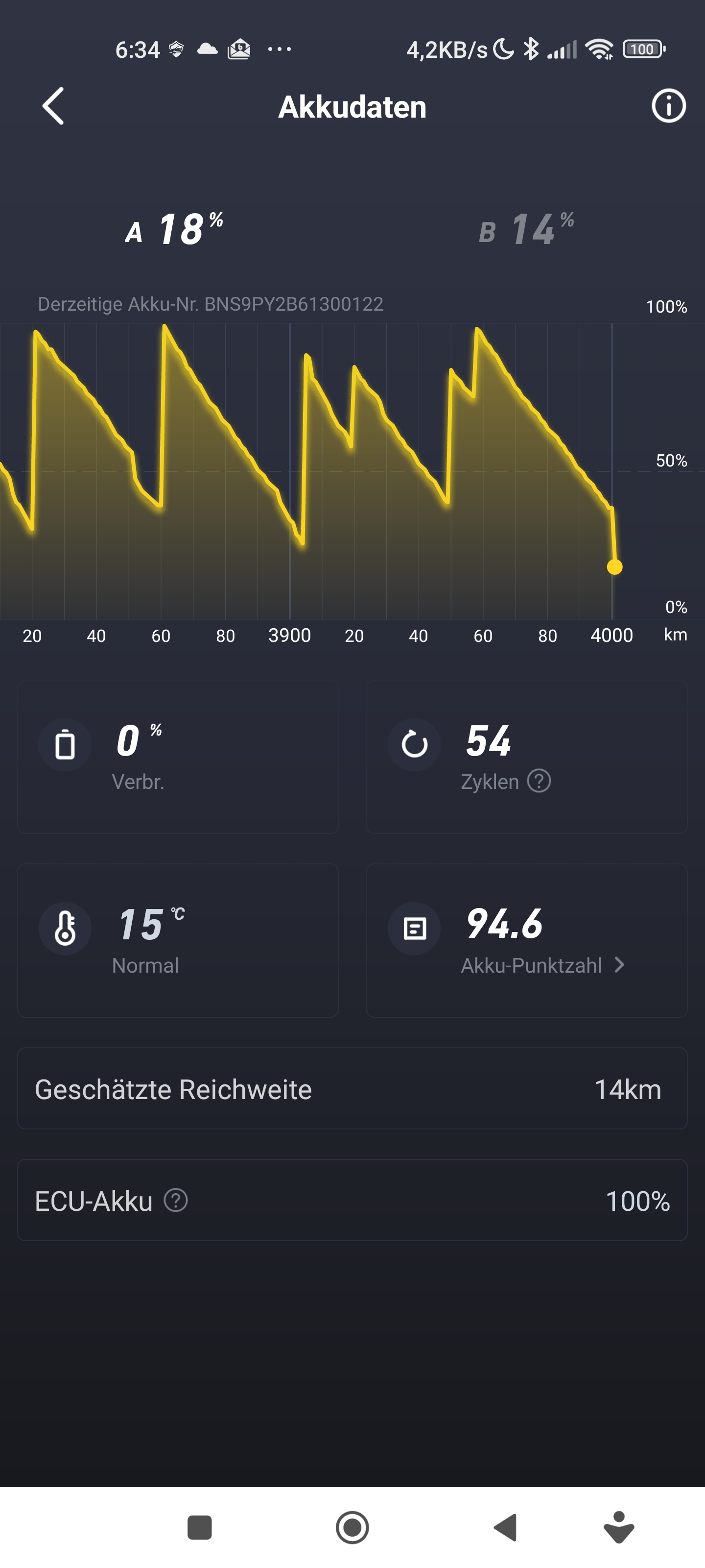 Danach würde ich es einfach einmal beobachten. Würde es erstrangig aber auf eine BMS Korrektur setzen. Bis zu 5% am Tag können mal auftreten. Der ECU Akku will geladen werden, der Roller telefoniert die ganze Zeit nach Hause und vermittelt dir seinen Standort, das BMS will auch versorgt werden.