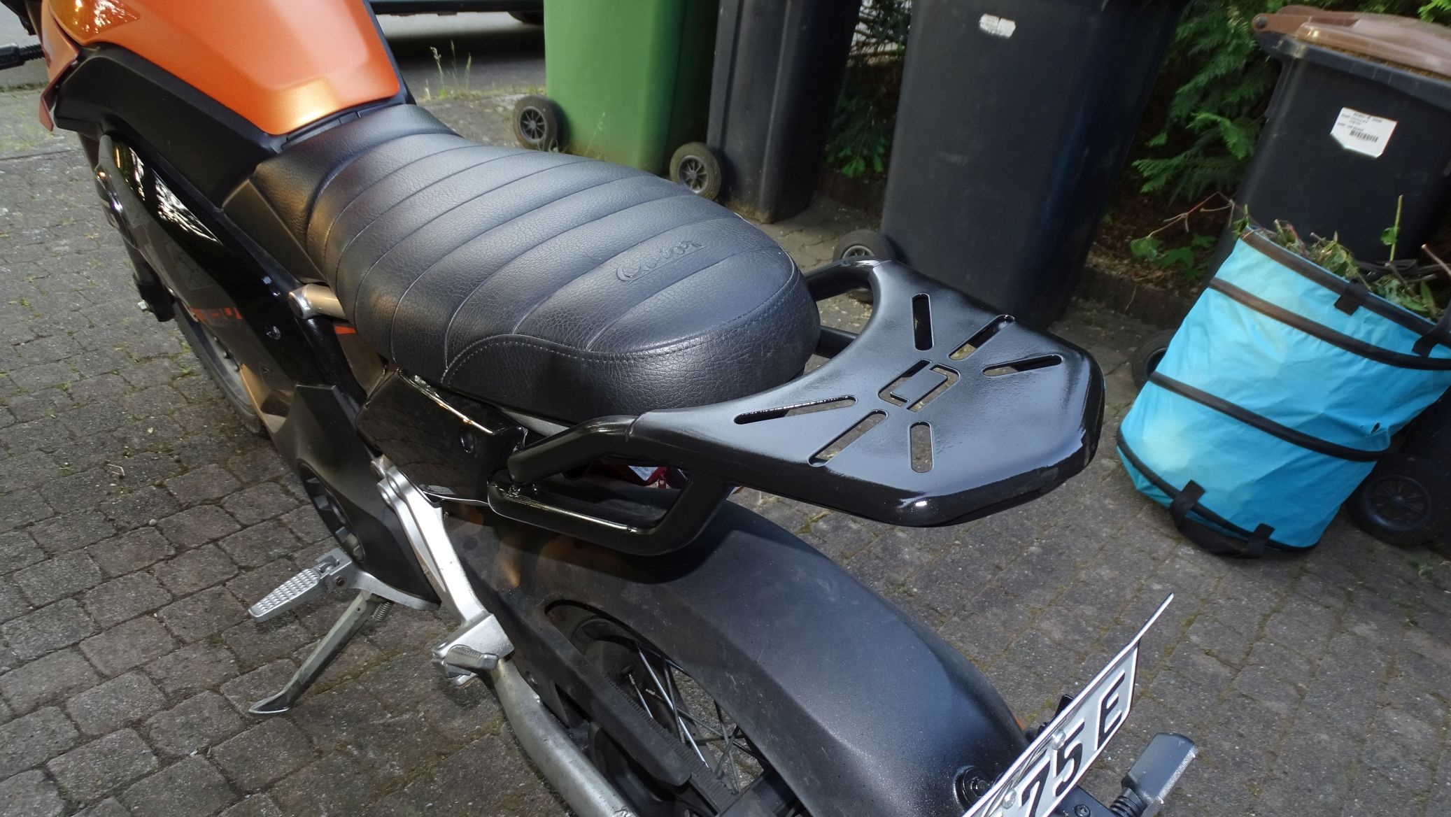 Selbst unbeladen musste ich ganz langsam über Schwellen und abgesenkte Bordsteine fahren sonst hatte ich wieder einen verbogenes Nummernschild. Mit meinen 62kg habe ich auch keinen Tiefgang auf dem Moped. Die Schrauben sind 3 mal gebrochen. Die neue Halterung ist gar kein Vergleich zu der Shad. Massiver dicker Stahl vernünftig an 4 Punkten befestigt. Hätte gleich diesen nehmen sollen.