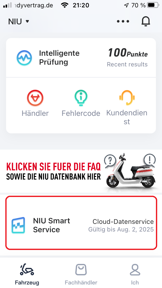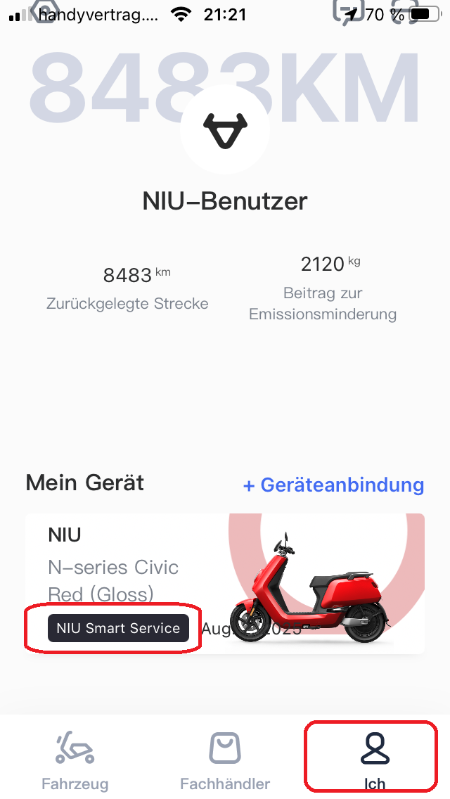In der App unten auf "Ich" > Unter "Mein Gerät" die Schaltfläche "NIU Smart Service" klicken