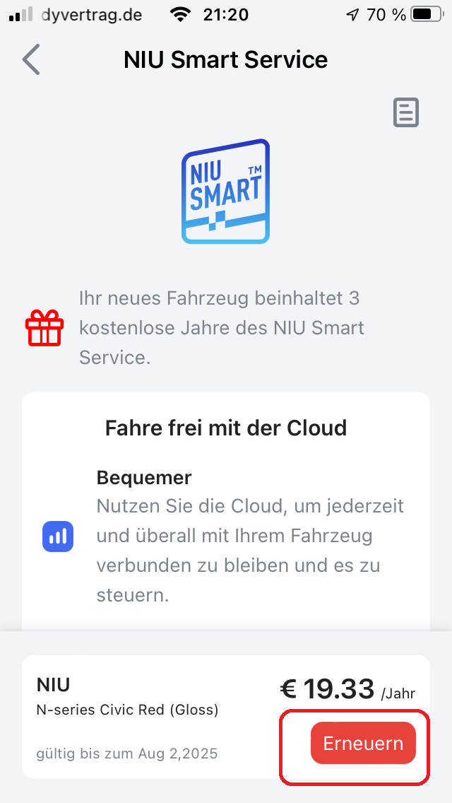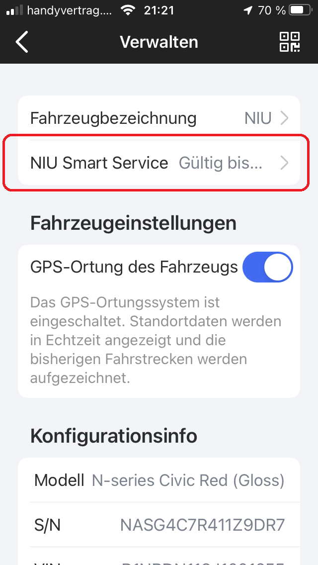 > Ganz nach unten scrollen bis 'NIU Smart Service'