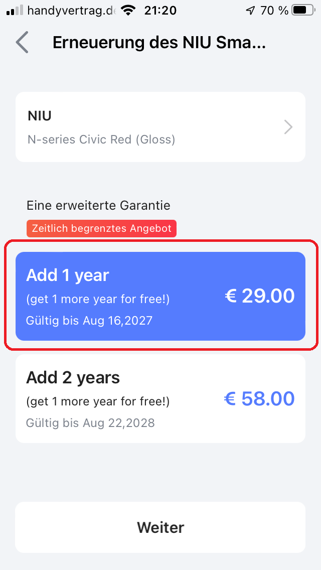 Jetzt könnte ich in der App sofort erneut für € 29,- für weitere 2 Jahre (1 Jahr plus 1 Jahr "gratis") bis August 2027 verlängern.