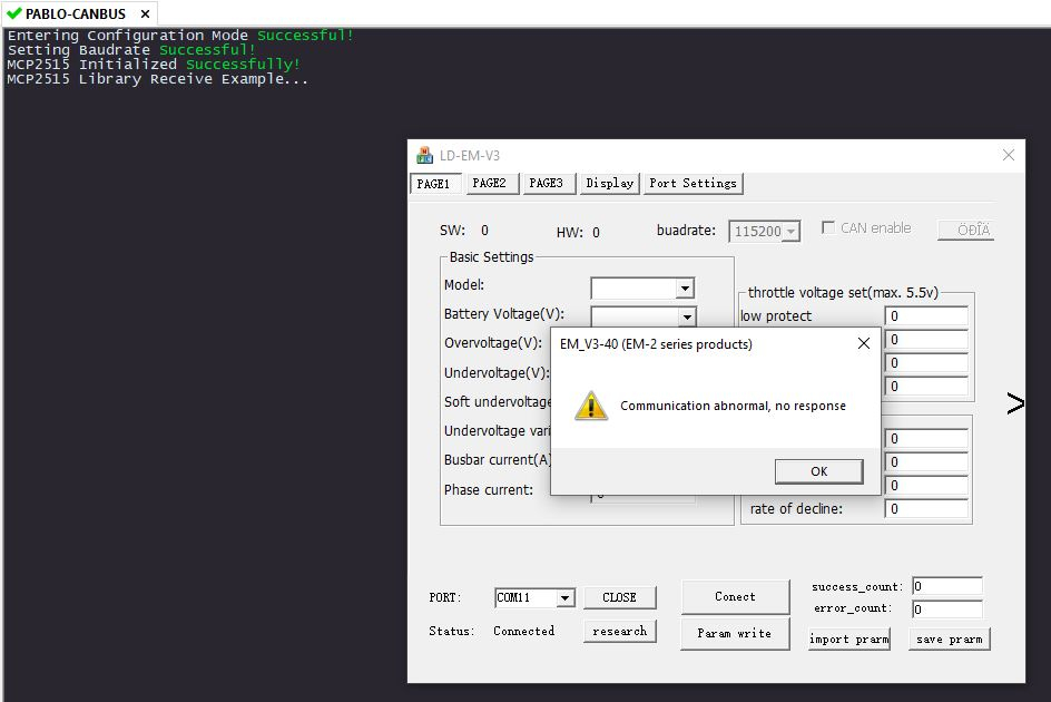 MIT gestarteter Votol-Software - aber OHNE Controller sendet er beim CONECT-Versuch scr002 (9 identische CAN-Telegramme der ID 0x3ff) und meldet dann in der Software "Communication abnormal, no response". Auch hier: Wenn das NICHT klappt, liegt es sicher nicht am Votol oder dessen Software!