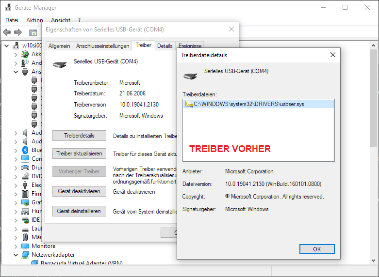 - Gerätename im Gerätemanager "Serielles USB-Gerät"