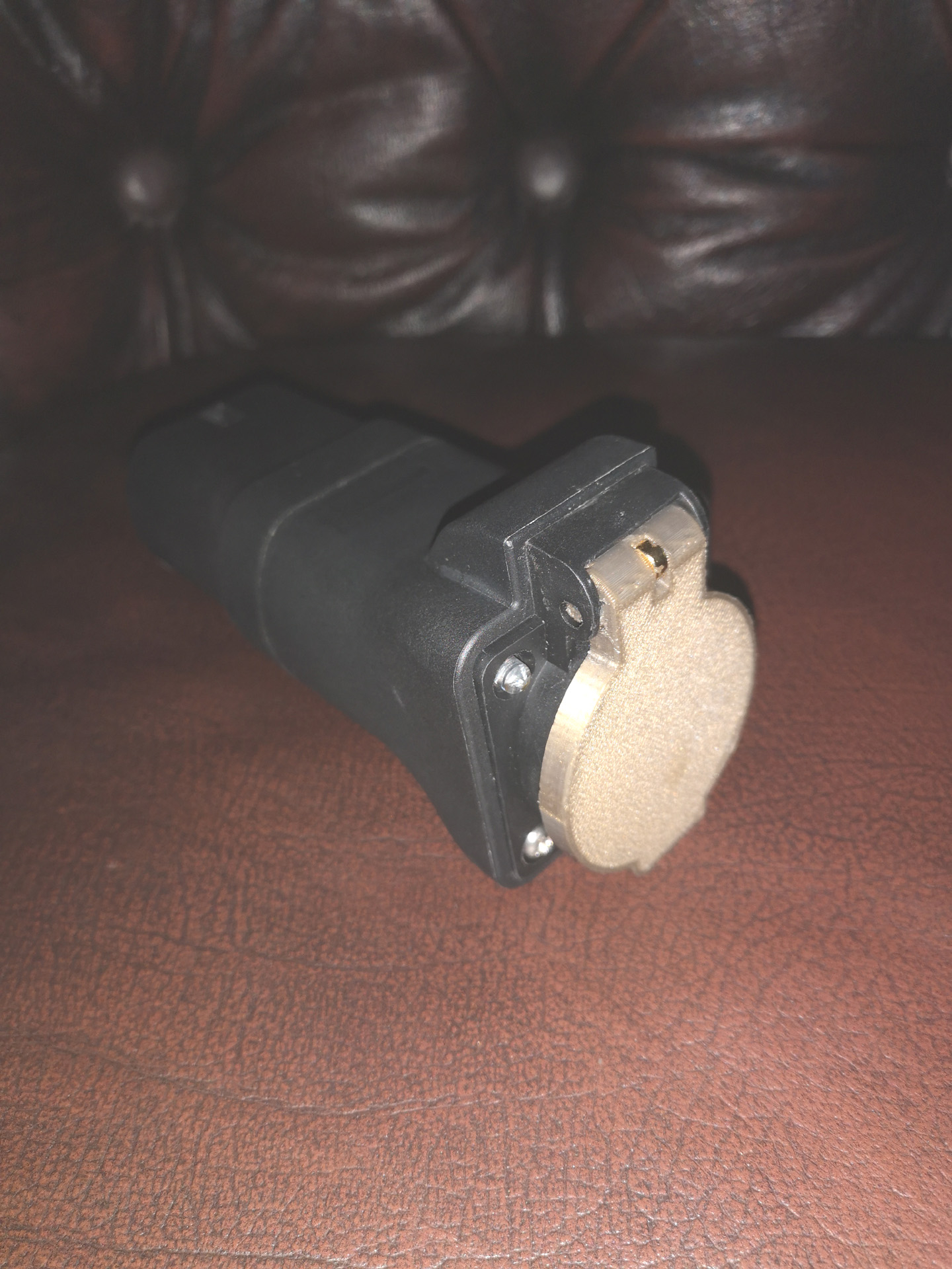 3. Ist das etwas längere Typ-2 Schuko-Adapter, welches mit Reed-Kontakt und Micro-Switch (innen) keine zusätzlich sichtbaren Bedienelemente aufweist. Darüber hinaus habe ich für PP & CP Messingstifte eingebaut, die genauso lang sind wie die dicken N, L, PE Stifte für den Leistungsteil.