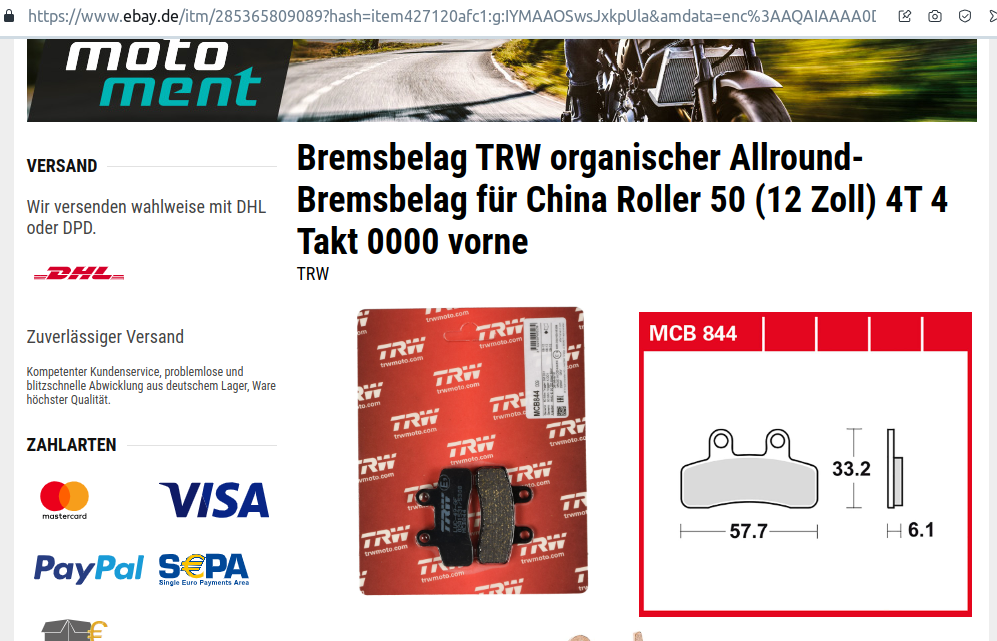 Nun frage ich mich aber, welche die richtige Größe wären. Gibt man bei eBay "Bremsbeläge China Roller" ein, erscheinen im wesentlichen zwei Formate zur Auswahl. Und zwar beispielsweise diese von TRW (= Markenhersteller):