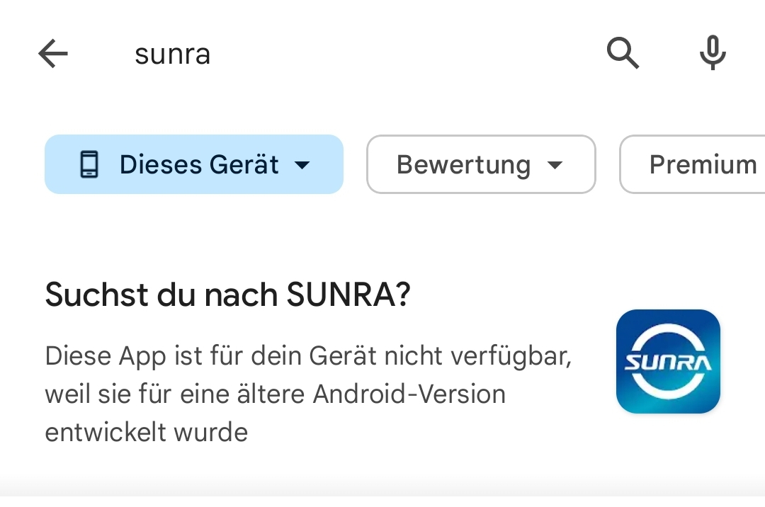 Ich habe das Samsung S22 Ultra. Anscheinend ist der SunraApp mein Handy zu neu 🙄