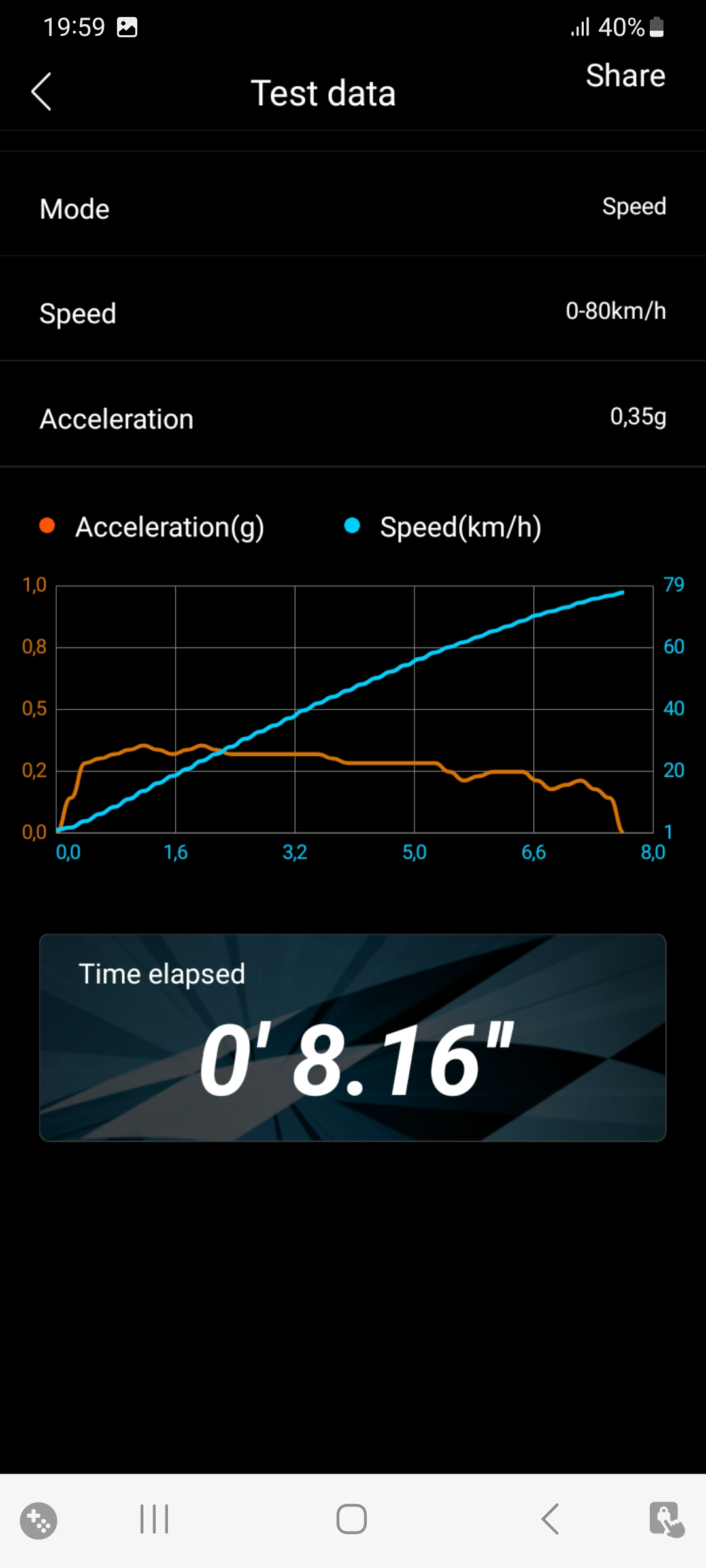 So ist er noch mal etwas zügiger bis 80 als mit 220A /600A, da waren es zwischen 8,5 und 9 Sekunden.