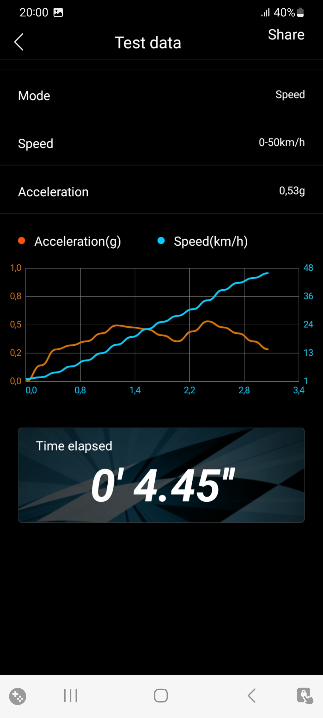 Die beiden un der Mitte so bei 75-90Grad waren die schnellsten, da hat der Controller nicht hörbar runter geregelt. Es wurde immer auf der selben Strecke , einmal hin und einmal wieder zurück gefahren. 0-50 habe ich auch noch zweimal gemacht.