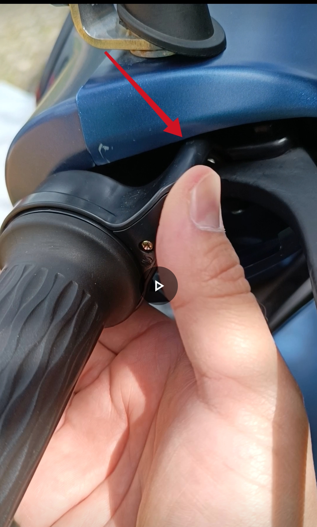 Der Gasgriff muss eigentlich zu befestigen sein und ist momentan loose. Auch wenn ich keinen DTR habe, gehe ich zu 90% davon aus, das dort ein Löchlein ist, durch das ein dünner (innen-)Sechskantschlüssel (ImBus) in den Kopf einer Klemmschraube gesteckt werden kann. Ist die richtige ImBus-Größe gefunden, sollte sich der Griff am Lenker fest verschrauben lassen. (die Kreuzschlitz-Schraube unter dem Daumen ist nicht gemeint)